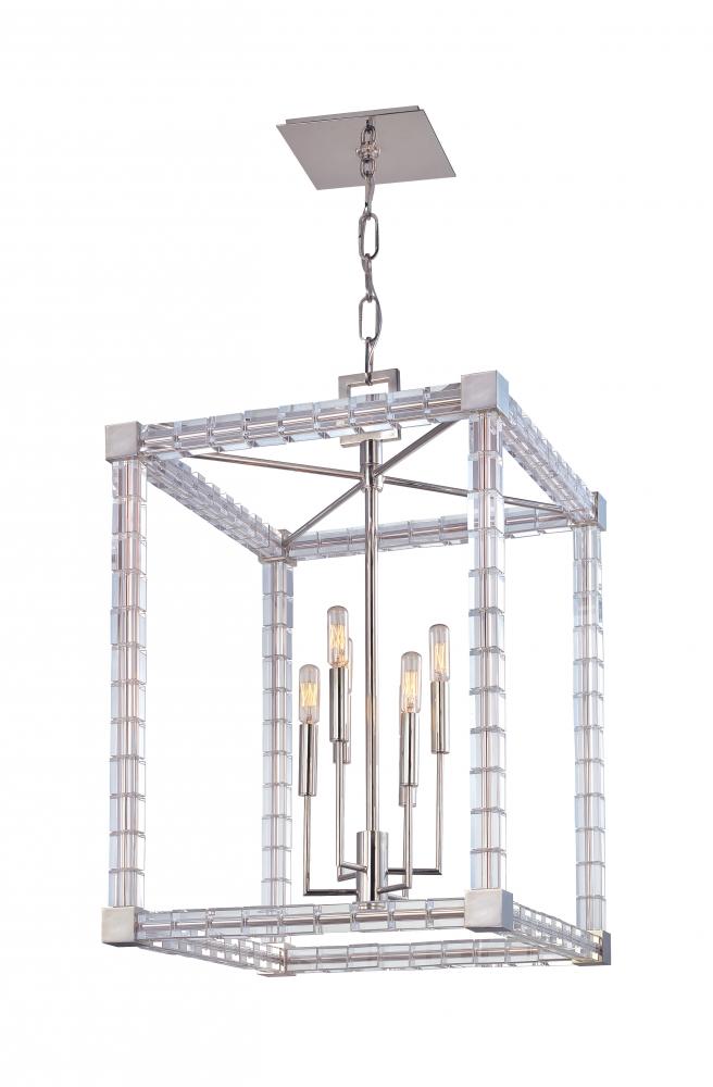 The fixture’s unexpected impact comes from its futuristic materials and shapes and its icy crystal cubes, stacked along the metal frame. Subtly staggered clusters of candelabra lamps cast a sparkling glow along this prismatic frame, playing a brilliant light pattern across any room. Polished Nickel preserves the fixture’s winter chill while Aged Brass accents add warming contrast.
