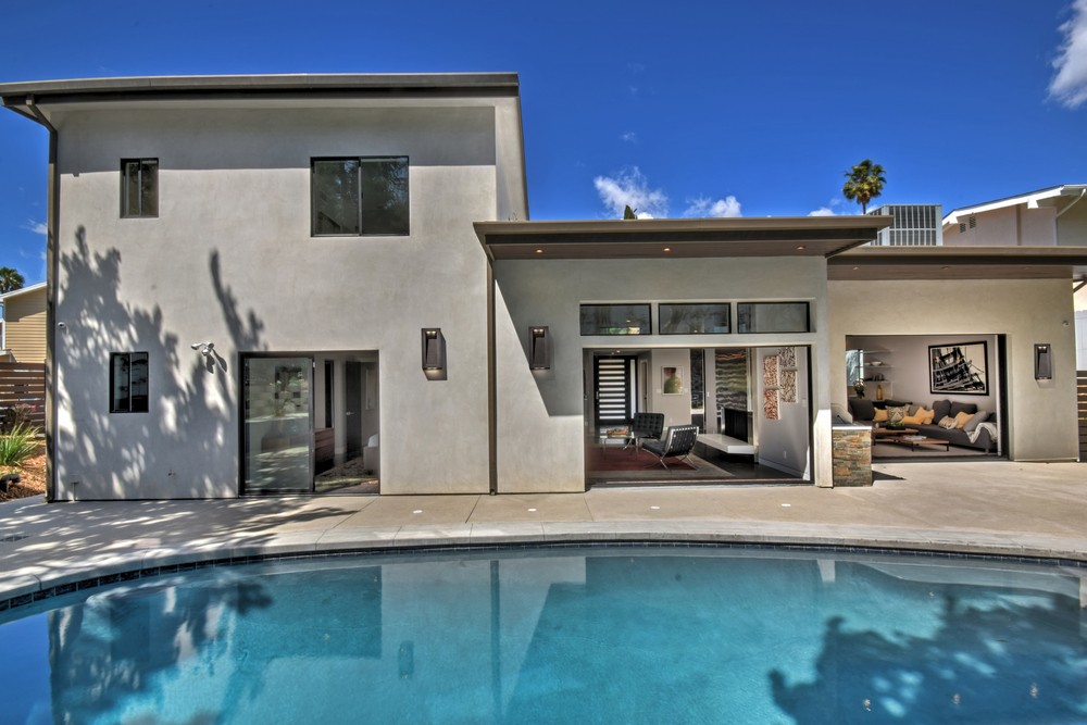 This great architectural outdoor design provides illumination from two places. A slash of light washes down the grated diffuser and out away from the wall while additional light is directed out the bottom straight down that washes the wall and illuminates