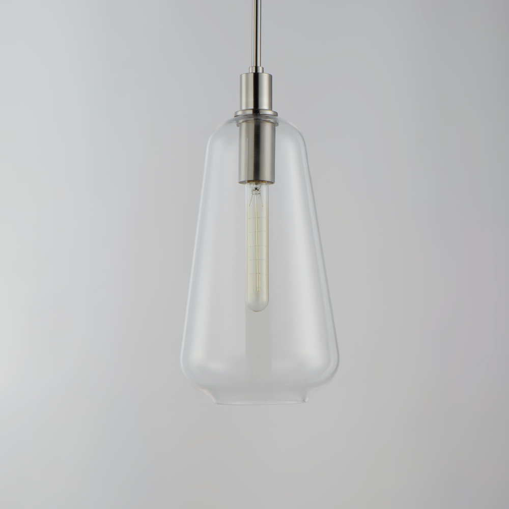 Pendants of Clear glass in unique elongated and undulating shapes with various sizes. This series pairs well with popular finishes in hardware and plumbing, giving you the flexibility to take chances with designer statement pieces. The metalwork is availab