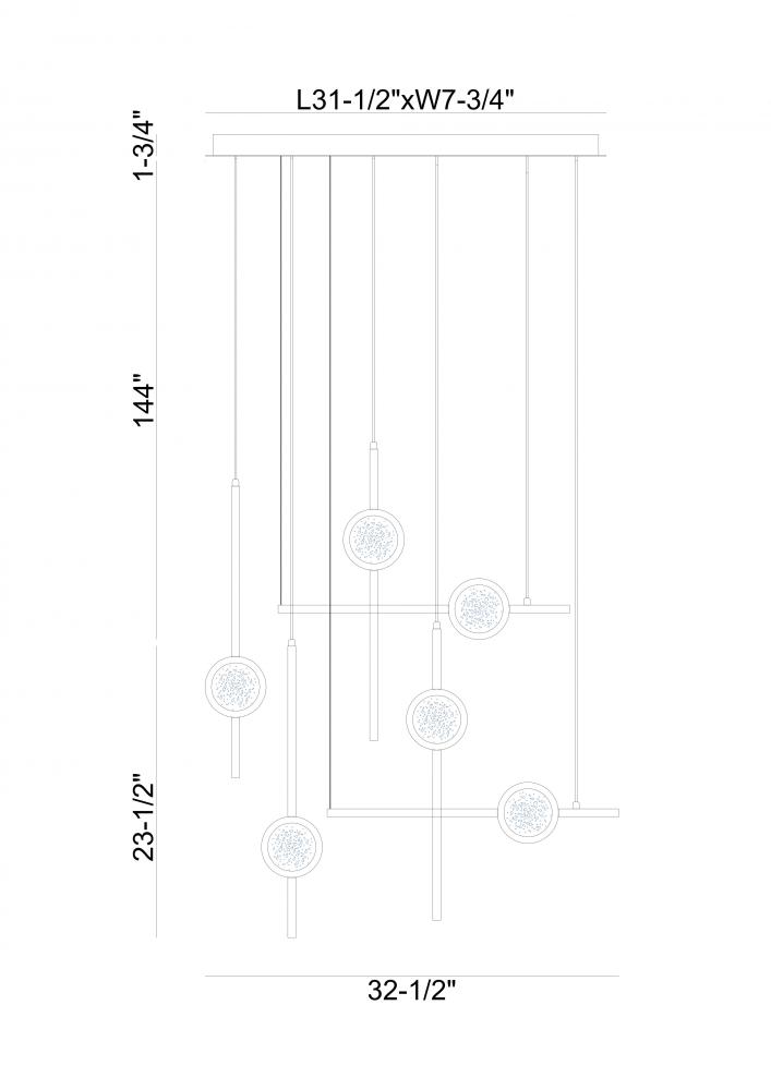 Various sized anodized rods suspend vertically in black or gold finishes. Each rod is furnished with a clear seeded glass orb that perfectly sits within an anodized ring.
