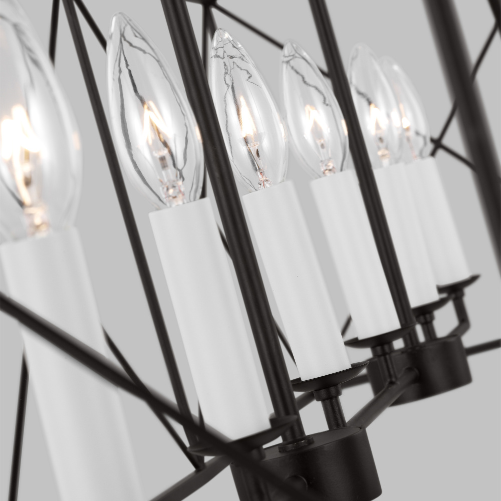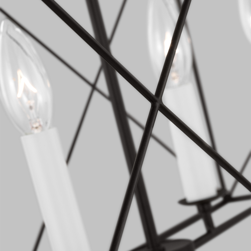 The Beatrix series by Chapman & Myers is open-caged design chandelier adding a bright light to any modern farmhouse home decor. It features white candelabra candle holder and refined finishes, showing a classic and rustic flair. Each lantern has a distinctive X cross detailing on their frame which adds both strength and visual interest. Ideal for over a kitchen island or dining room table.