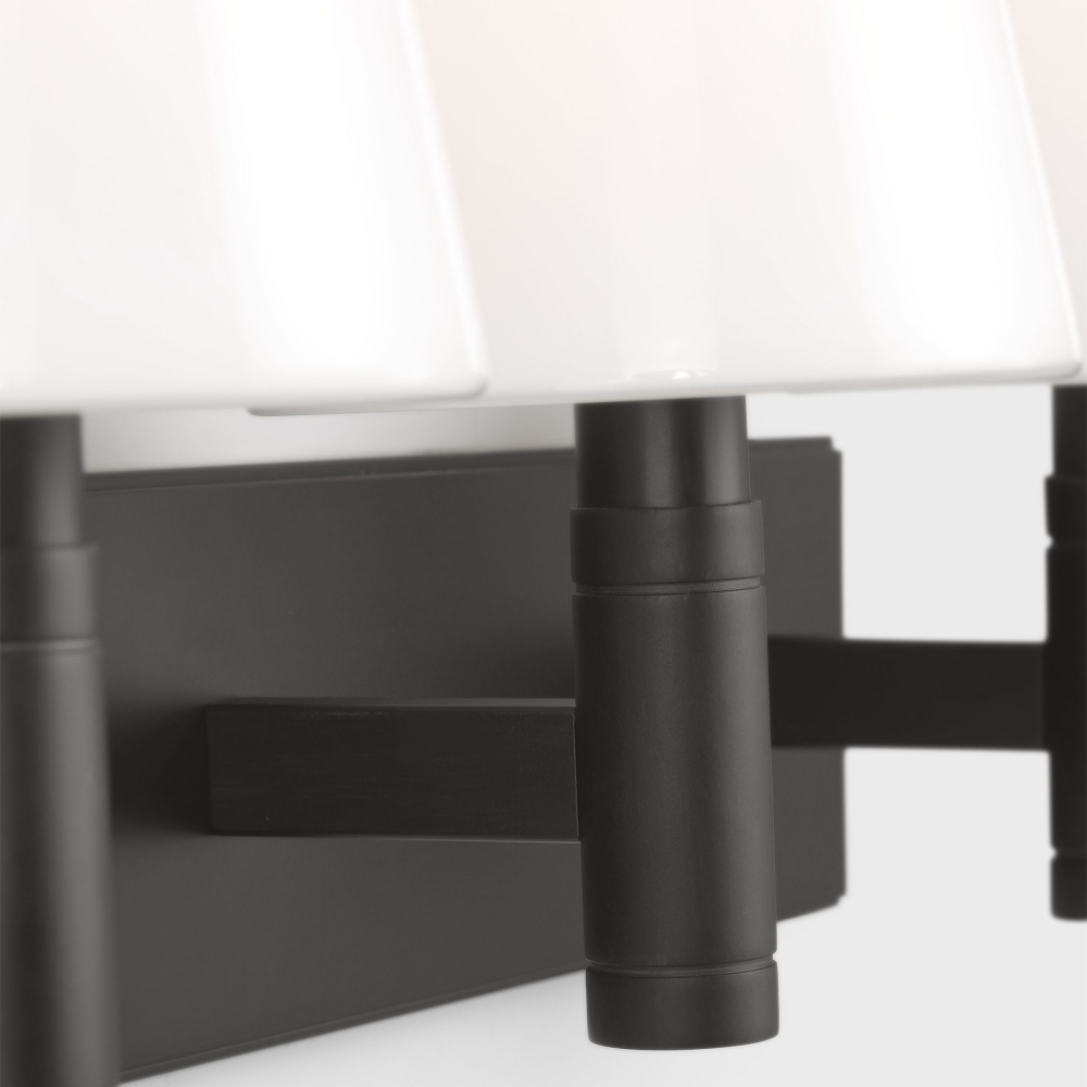 The Beckham Classic three light vanity fixture in aged iron offers shadow-free lighting in your powder room, spa, or master bath room. Traditional silhouette with modern barrel detail on both the central hub and socket