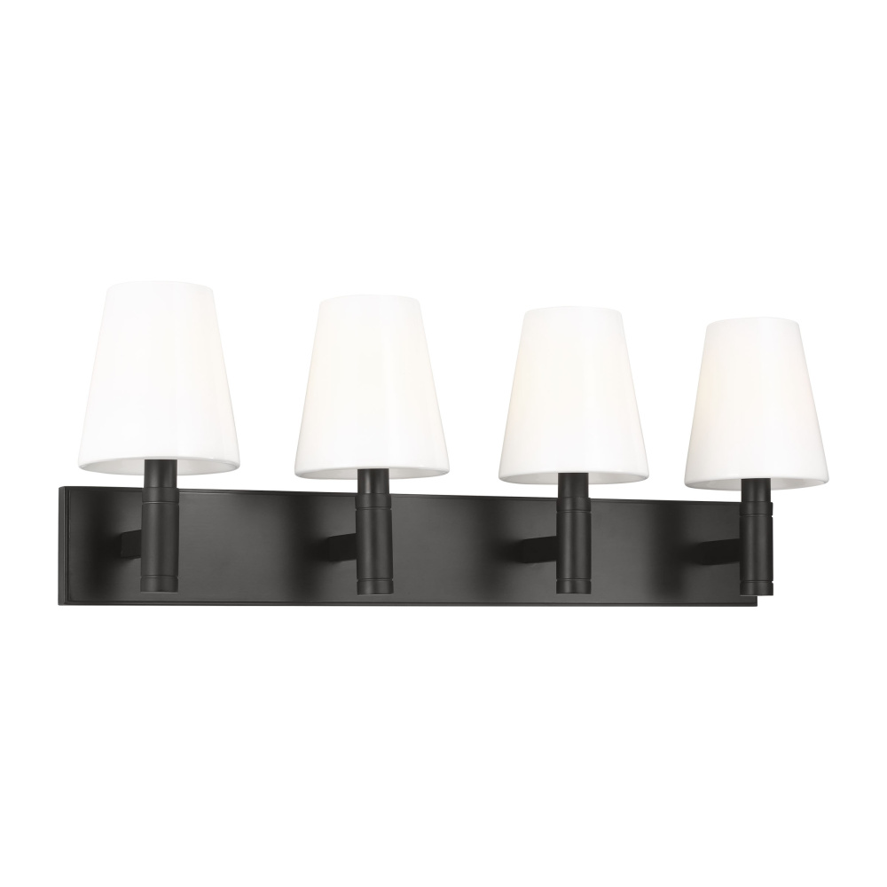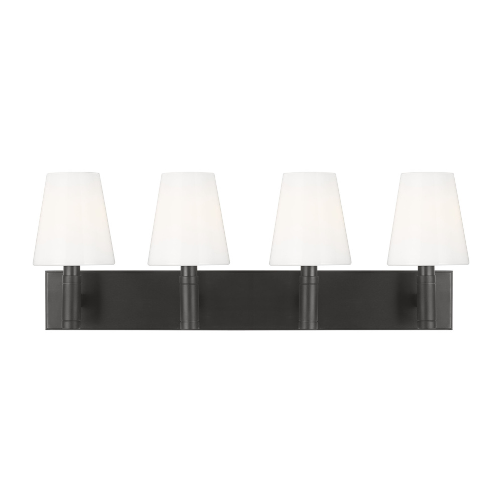 The Beckham Classic four light vanity fixture in aged iron provides abundant light for your bath vanity, while adding a layer of today's style to your interior design. Traditional silhouette with modern barrel detail on both the central hub and socket