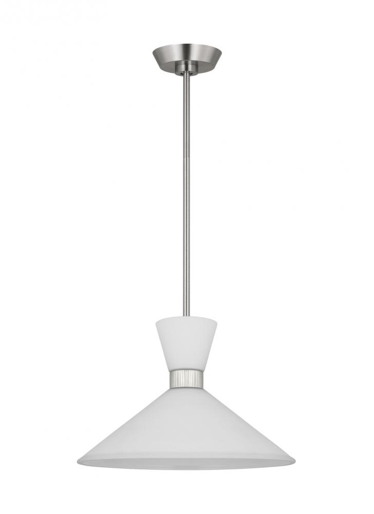 Inspired by playful mid-century modern design, the Drew & Jonathan Belcarra Medium Pendant is accentuated by a flared glass shade with ribbed metal details and etched white glass that bestows an almost whimsical touch to the clean design. Available in three finishes, Brushed Steel, Midnight Black, and Satin Brass, the Belcarra looks great on its own or when grouped in multiples. This product may be mounted on a sloped ceiling and is cETL listed for damp locations, making it the perfect lighting solution for any space.
