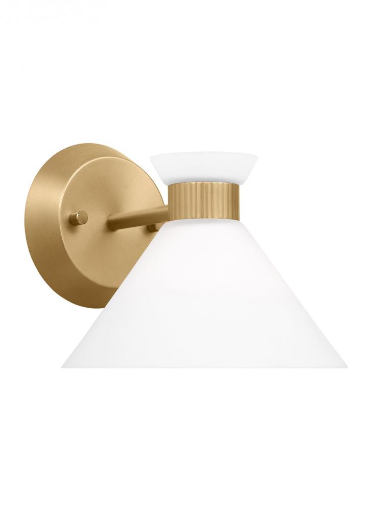 The flared glass shade with ribbed metal details and etched white glass of this light bring clean lines and classic mid-century modern design to any wall or bath space