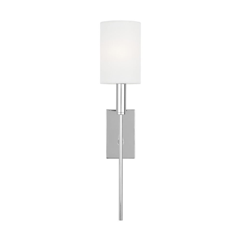 The Brianna one light wall sconce by Ellen DeGeneres in Polished Nickel offers shadow-free lighting in your powder room, spa, or master bath room. Brianna's graceful, seamless curvature and elongated tubular arms lend fluidity and modern appeal to this classic minimalist silhouette. Available in rich Aged Iron, Burnished Brass and Polished Nickel finish. Brianna wall sconces include cylindrical shades in fresh White Linen. We are expanding this top selling series by Ellen DeGeneres to include a tail sconce in three finishes.