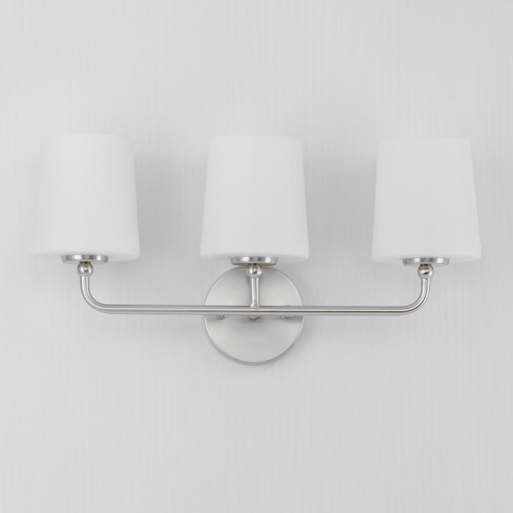 Understated elegance and convenience in its design, the simple curved arms of the Bristol collection outstretch in elongated proportions that terminate at a tapered Satin White glass shade. Designed to emulate a traditional fabric shade, the material being