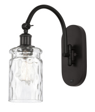 the arm swivels side to side at the base and the solid brass 180 degree adjustable swivel at the top of the socket has internal teeth that lock in at 5 degree intervals and allows for up and down tilting of the shade