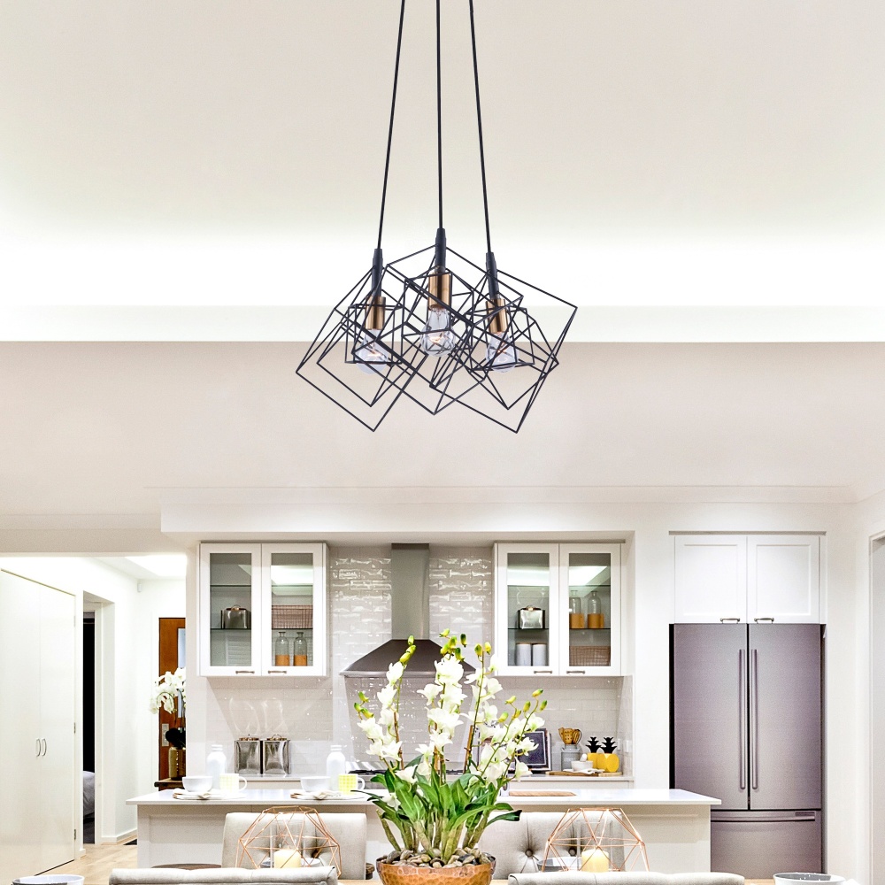 Geometric in design the Artistry collection is meets the transitional type décor criteria. The outer frame is matte black and the interior is plated in harvest brass. Triple pendant shown. (Also available with polished nickel interior)