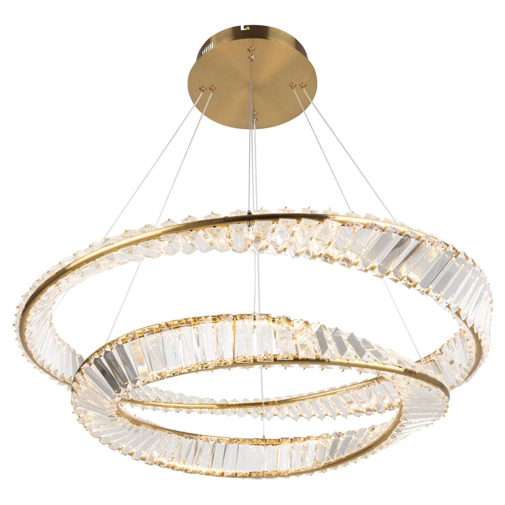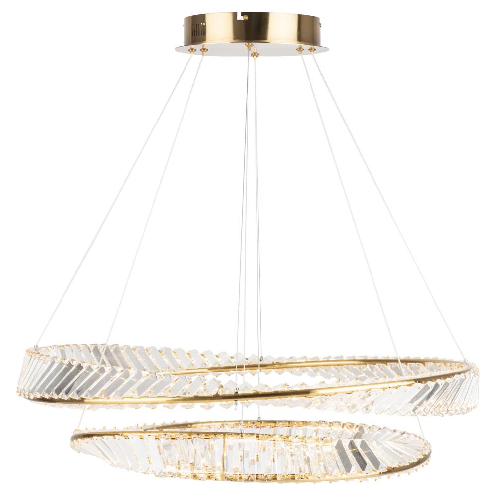 Sparkling from every angle, the Stella collection is simply timeless. The two tier chandelier is draped with authentic crystal and complimented with a Brushed Brass frame (also available in Satin Nickel). As your eye follows the frame it twists around the crystal in a unique fashion. This pendant is illuminated by bright and energy efficient LEDs (4 sizes available).