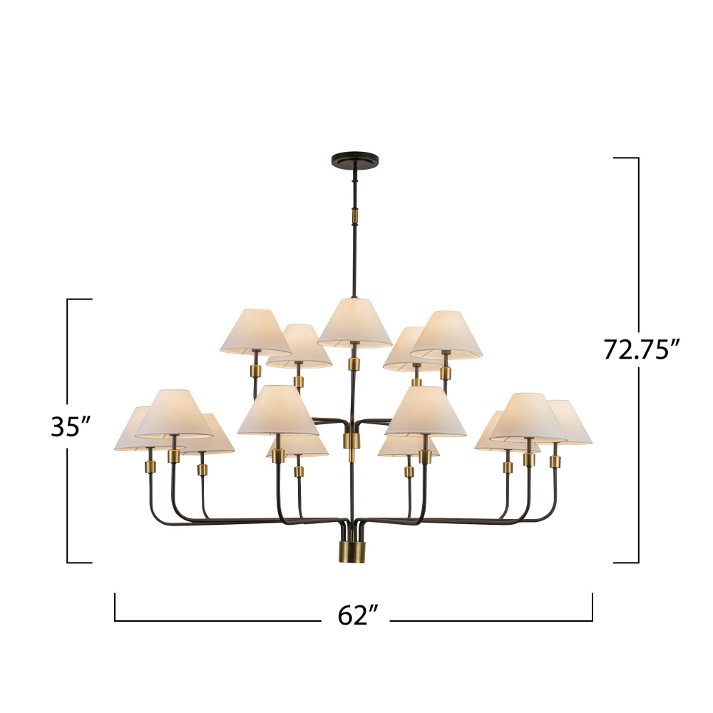 The Providence collection two tier round 15 light chandelier designed by the Lighting Pulse is a harmonious blend of timeless grace and contemporary refinement. Its hardback linen fabric shade softly diffuses light, casting a gentle glow that evokes a sense of serenity. The bold black frame, accentuated with warm brass details, adds a touch of refined charm, making it a perfect addition to any space seeking effortless sophistication.
