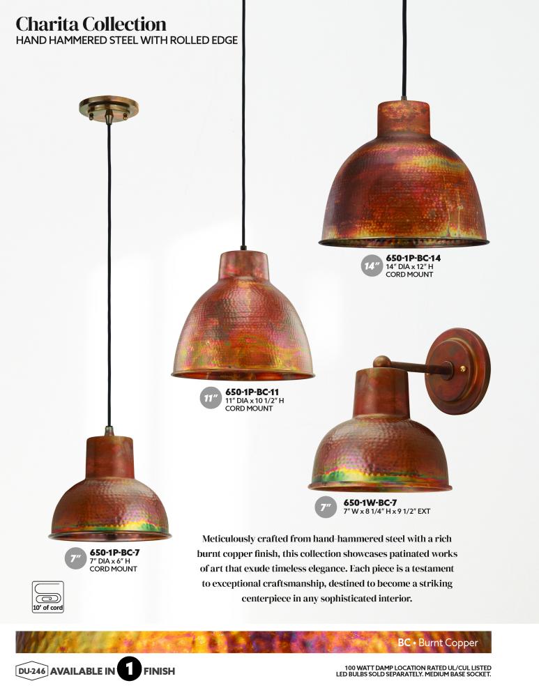 Whether you're looking for a more industrial look or a bit of international style, the Charita fits the bill. Crafted out of hand-hammered steel in a wonderful burnt copper finish, this collection features patinated pieces of art that are sure to be th