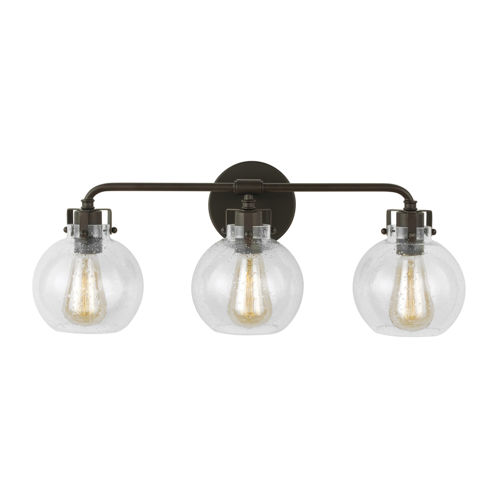 Clara features Clear Seeded glass shades that subtly diffuse the lamping while allowing the exposed bulb to be a central design element of the fixture. Choose the look that is right for your space with four finish options: Burnished Brass, Chrome, Satin Nickel, Oil Rubbed Bronze or a two-toned finish of Textured Black with Chrome.