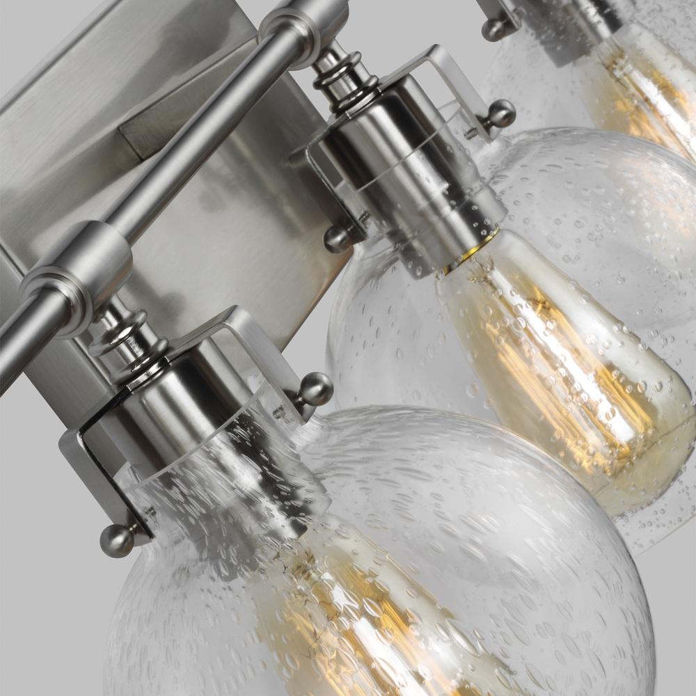 Clara features Clear Seeded glass shades that subtly diffuse the lamping while allowing the exposed bulb to be a central design element of the fixture. Choose the look that is right for your space with four finish options: Burnished Brass, Chrome, Satin Nickel, Oil Rubbed Bronze or a two-toned finish of Textured Black with Chrome.