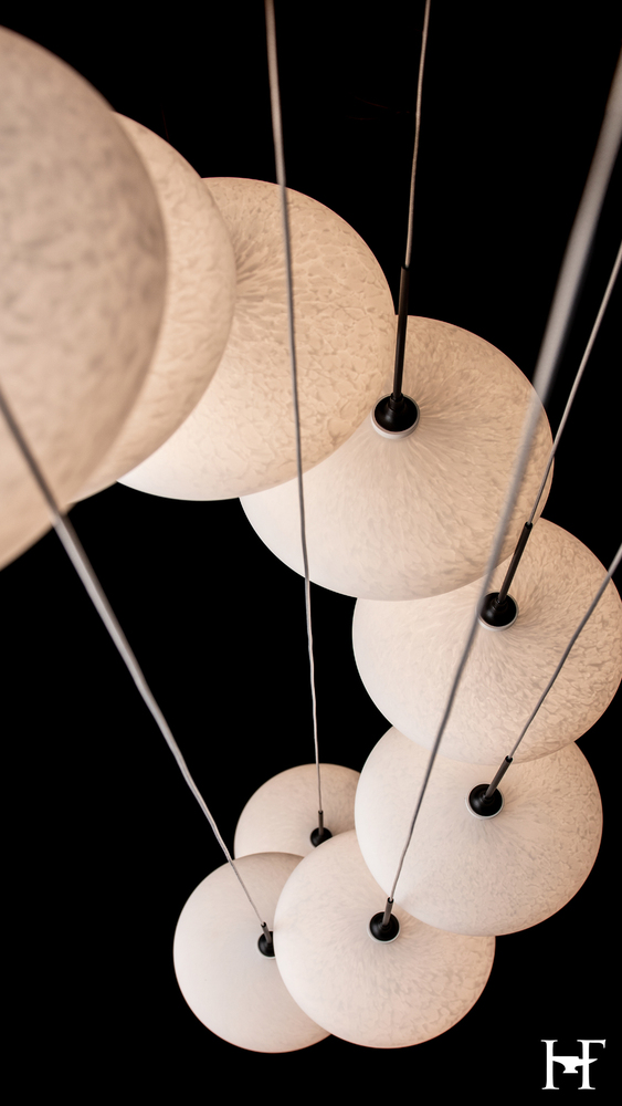 The Clouds 9-Light Pendant features a round canopy from which nine unique white tortoiseshell-like glass shades are in staggered suspension. A focal piece for any space, a billow of puffy Clouds appears to cascade downward from the canopy. Cable lengths are customizable to create the Clouds installation to suit the spatial design.