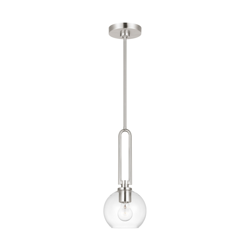 The Codyn one light mini pendant in brushed nickel silver is a contemporary take on a classic mid-century design. Clear glass shades with open-ended spheres accent the elongated keyhole strap detail, for a clean look. This minimalist collection relies on subtle details to create visual interest