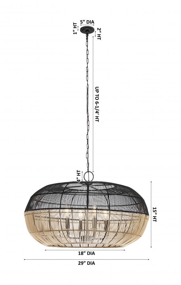 A large spherical pendant in natural tones, featuring a contrasting black weave design. Its striking open structure complements both rustic and modern spaces.