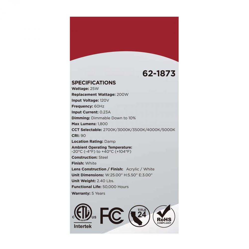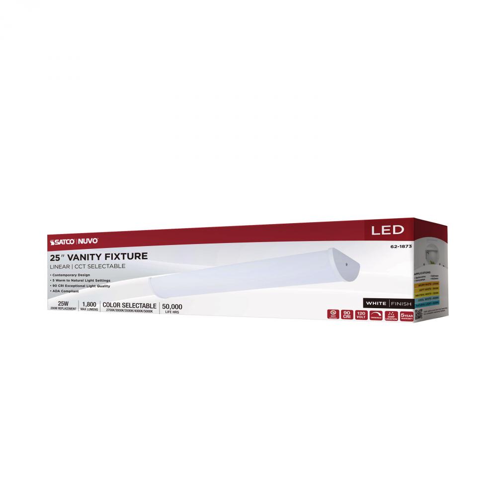 The SATCO NUVO 62-1873 Crispo 25-inch Vanity Fixture in All White features 5 CCT selectable technology (2700K–5000K) and 90 CRI illumination for vibrant color rendering. This 25-watt fixture replaces 200W incandescent lighting, providing energy-effi