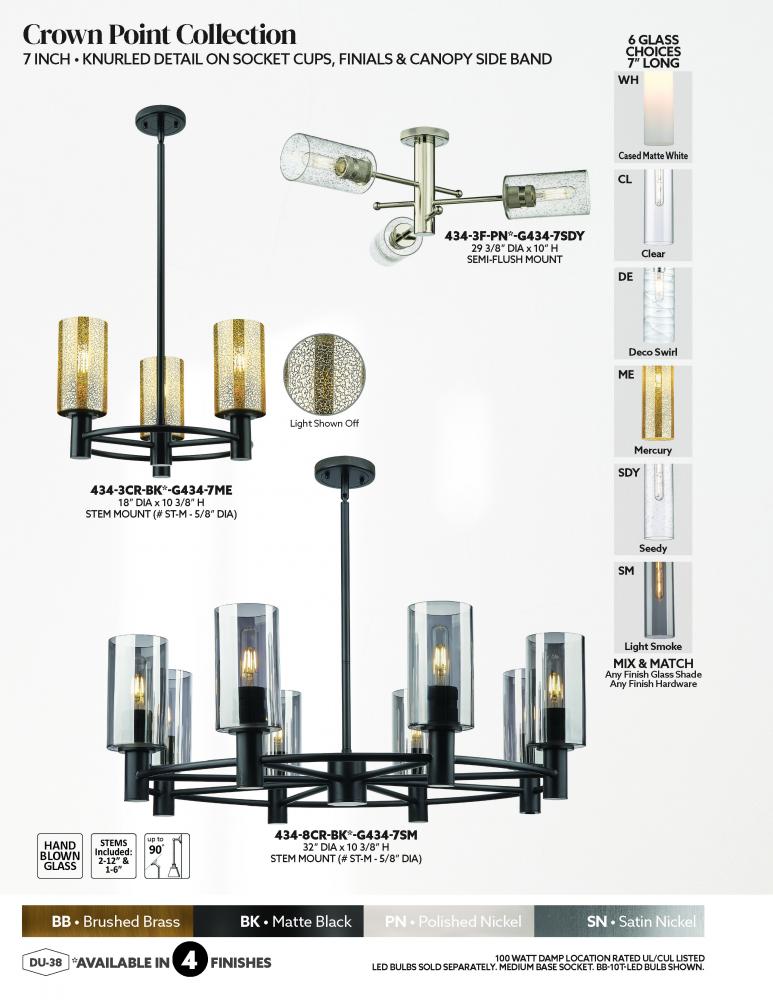 Details abound in the Crown Point Collection with an industrial take on modern sophistication. This stunning line of fixtures features cylindrical glass set in an updated restoration style frame with intricate knurling detail on the sockets, canopy, and fi