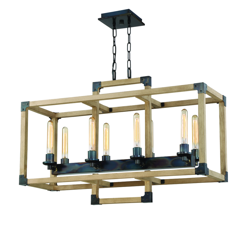 Cubic 8 Light Linear Chandelier in Fired Steel/Natural Wood