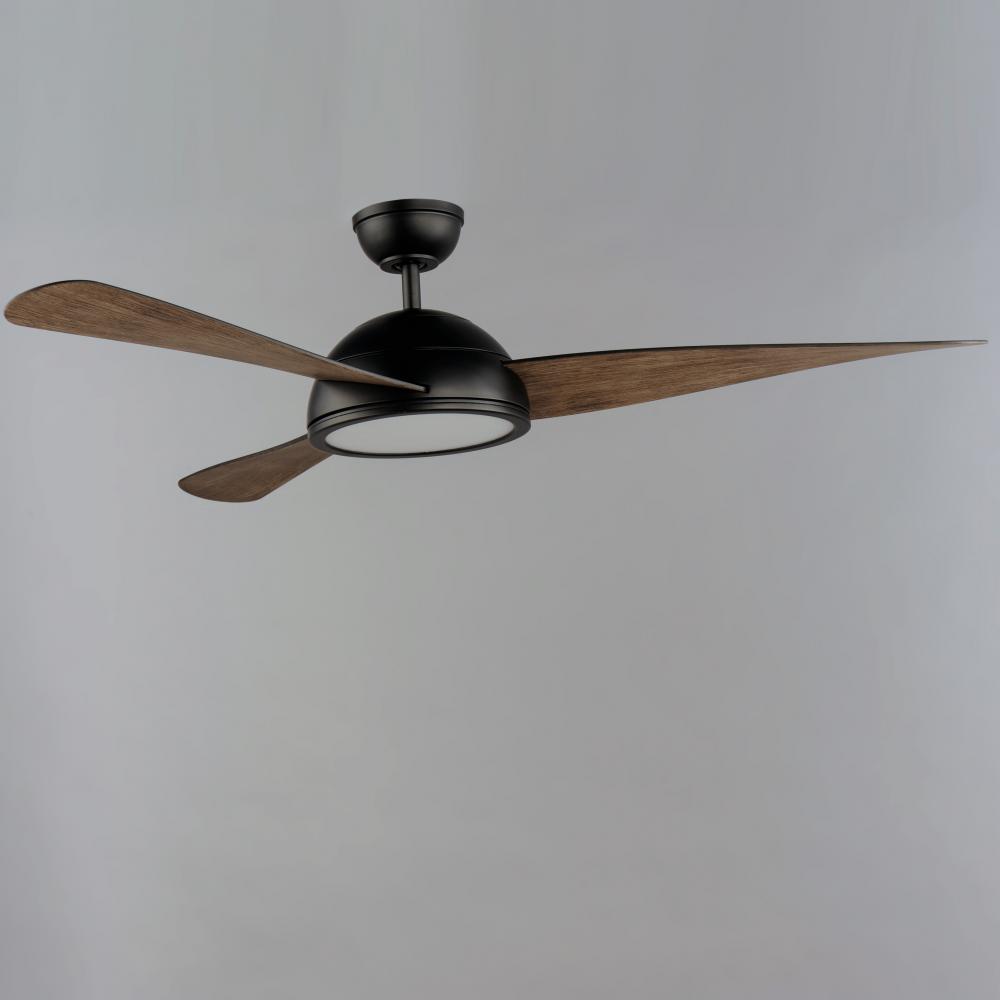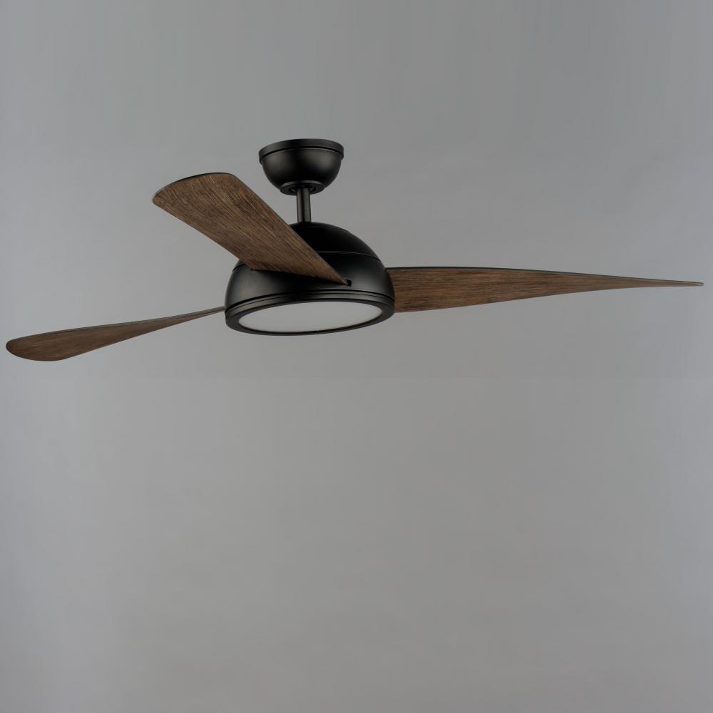 Sweeping arcs define this fan, designed for contemporary and refreshing upgrades. The central housing is domical, from which a trio of uniquely curved fan blades smoothly rotate. Available in Satin Nickel with Silver blades and Black with two-tone Walnut/B