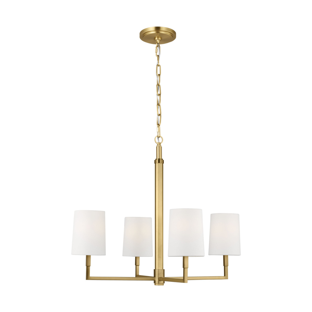 Crafted with Steel in a Burnished Brass finish with white linen fabric shades