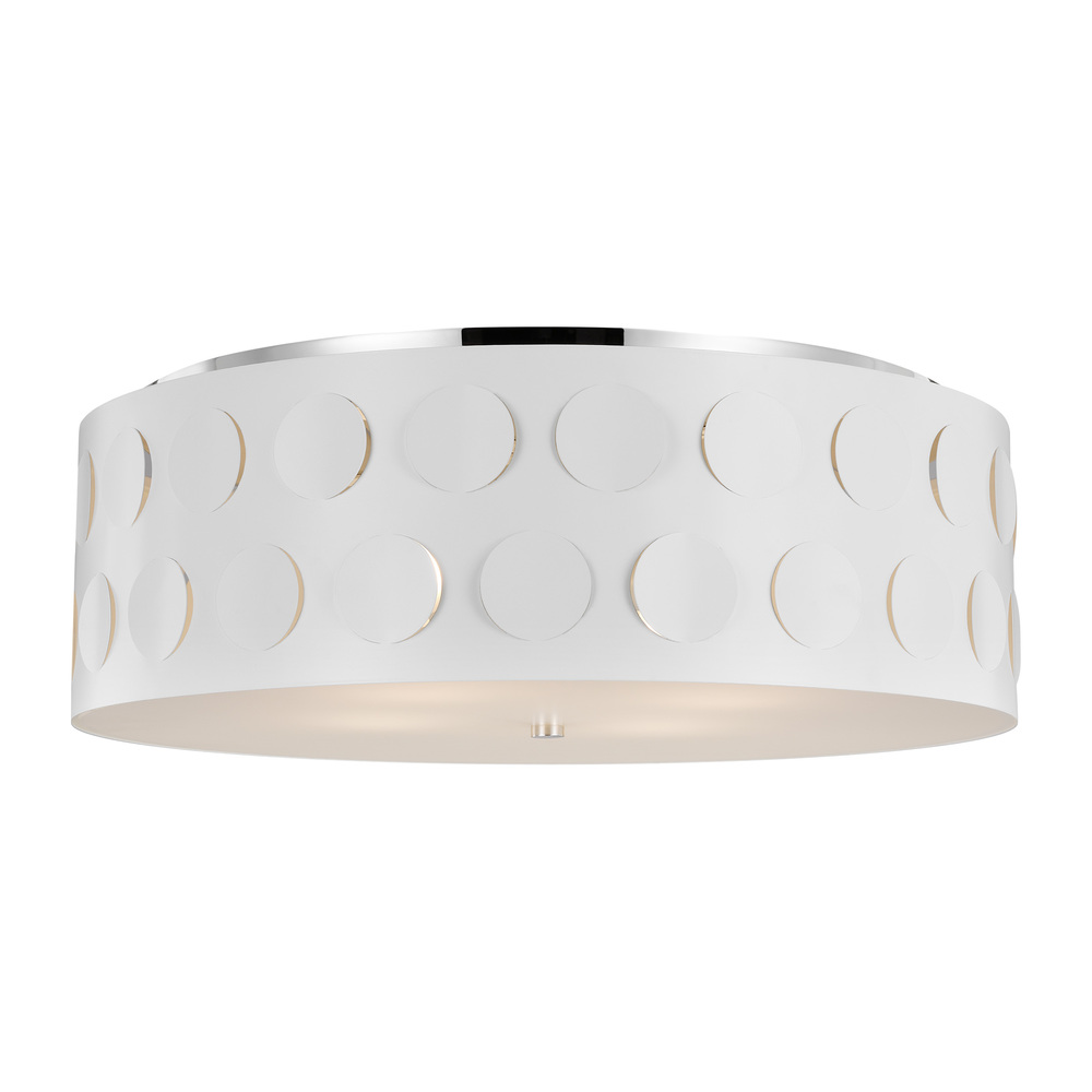 A cheerful, modern take on the classic flush mount, this fixture is crafted of steel and a matte white motif design with polished nickel accents.