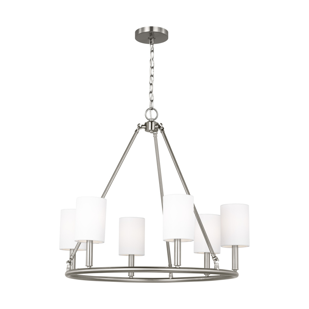 Designed by Drew & Jonathan Scott, Egmont is a classic design with clean lines and white linen shades, perfect for farmhouse or transitional style settings. It's made from metal featuring a wagon wheel body on the chandelier and a circular backplate on the wall sconce. The open framework at the top and bottom assures strong up-light. The overall style and multiple finishes work as well in a modern-farmhouse kitchen as they do in a vintage industrial loft.