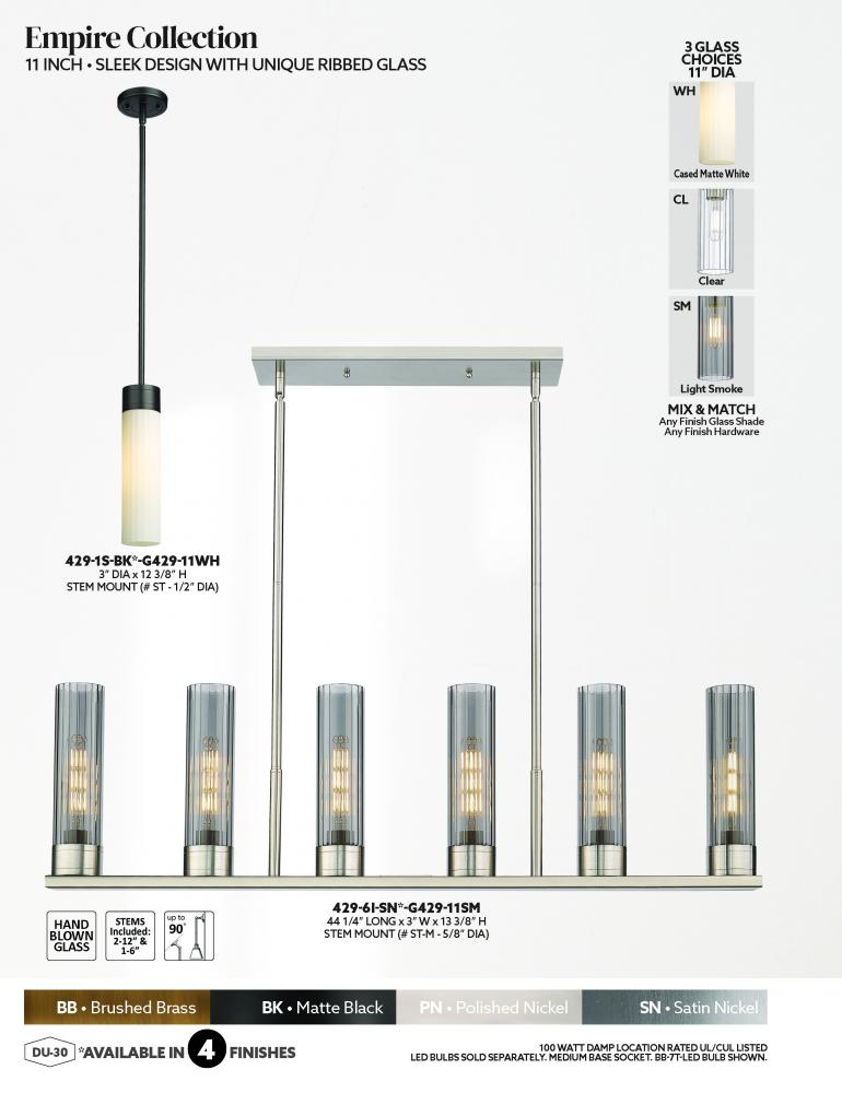 Empire is a showstopper and presents sophisticated style through subtle design. This exquisite line of fixtures features refined fluted pillar glass shades set in a delicately detailed metal frame.
