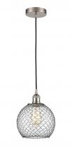 Farmhouse Chicken Wire - 1 Light - 8 inch - Brushed Satin Nickel - White Glass with Nickel Wire Shade - Cord hung - Mini Pendant