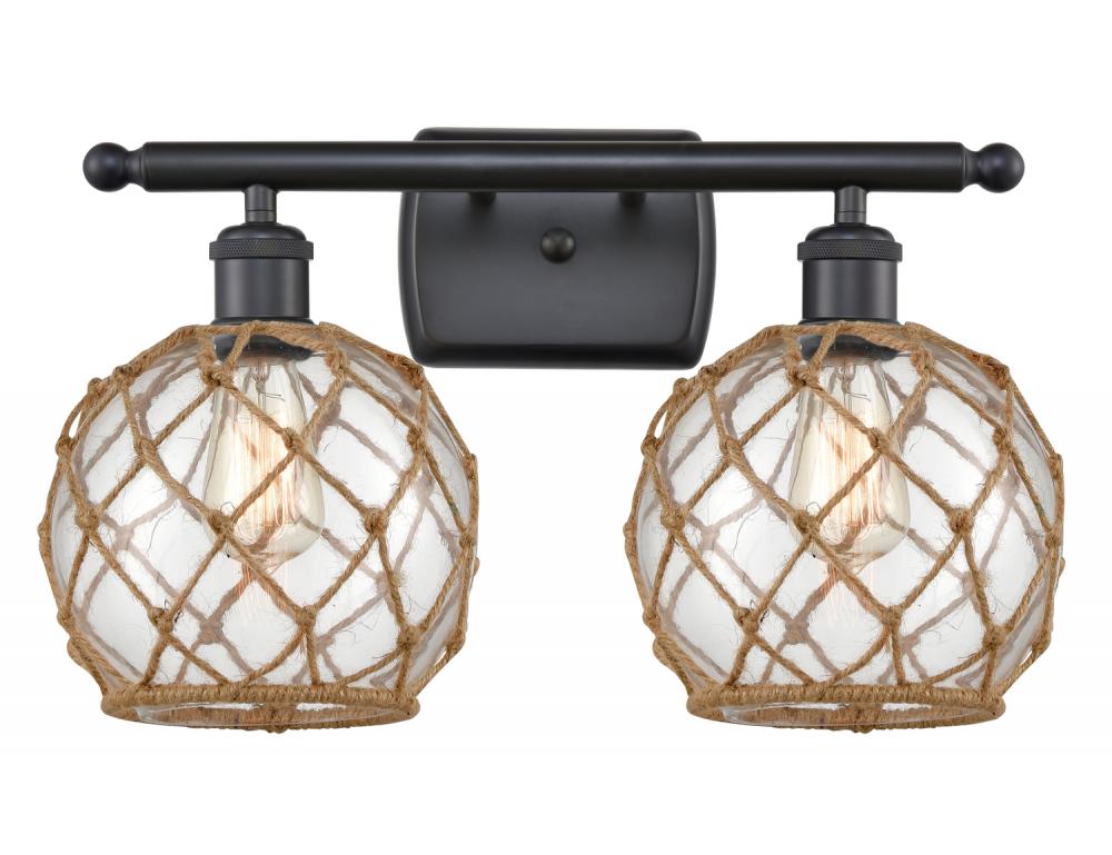 Farmhouse Rope - 2 Light - 18 inch - Matte Black - Clear Glass with Brown Rope Shade - Bath Vanity Light