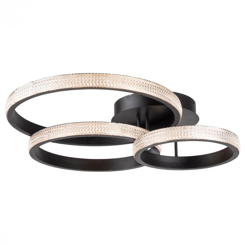 The Nova Collection three ring canopy sparkles from edge to edge. For a unique look each ring has a different diameter - large, medium then small. The interior of the ring and caopy are finished in a luxurious matte black. This product is illuminated by bright energy efficient LED which are dimmable.