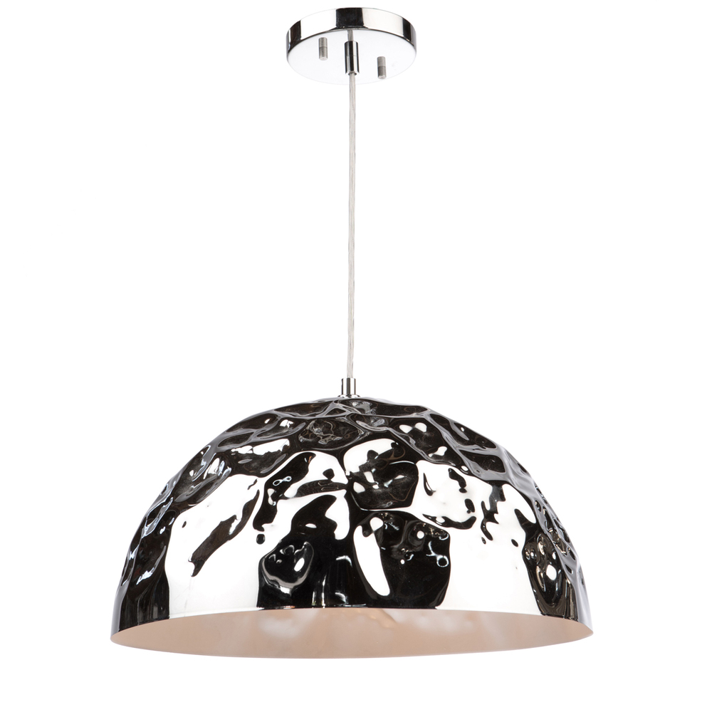 Named by design, the "Forged Metal" collection of pendants features a hammered metal shade. Shown in a chrome plated exterior with a painted white interior for maximum light reflection. Comes in multiple sizes and also available in a glossy white exterior.