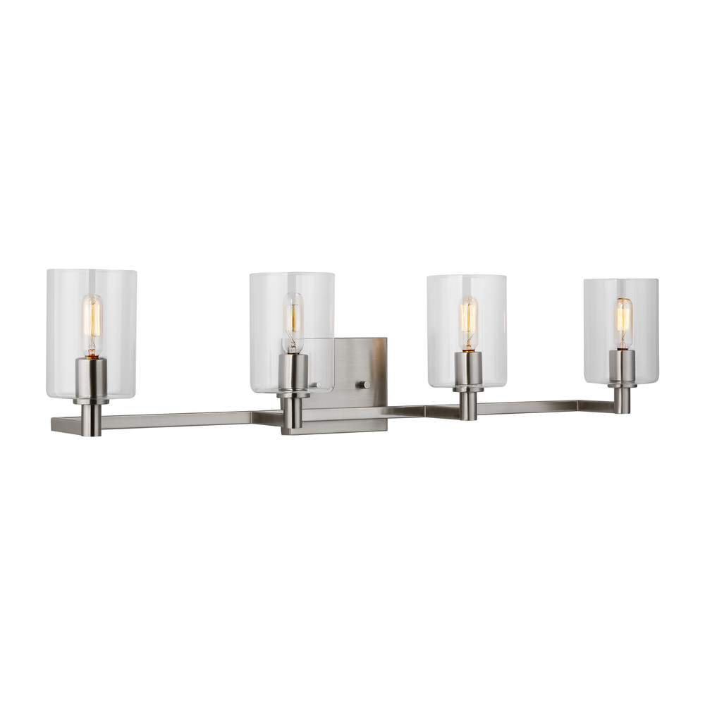 The Fullton four light vanity fixture in brushed nickel silver is sleek, contemporary, and uber minimalistic. Visual interest is created using a mix of rectangular and round frames, a subtle design detail. Although this collection is contemporary, it can be mixed in with variety of collections with ease.