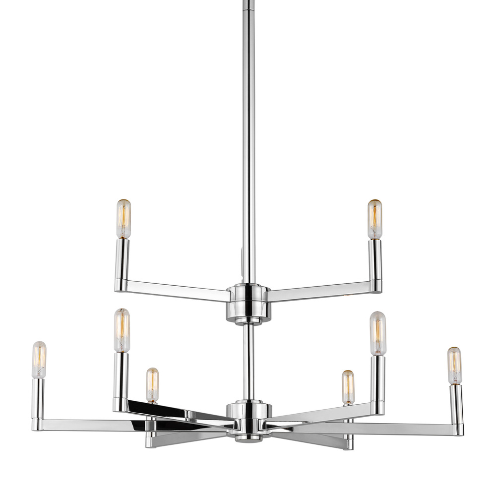 The Fullton nine light multi-tier chandelier in Chrome is sleek, contemporary, and uber minimalistic. Visual interest is created using a mix of rectangular and round frames, a subtle design detail. Although this collection is contemporary, it can be mixed in with variety of collections with ease.