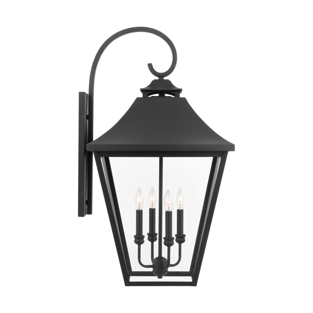 Designed by Sean Lavin, the Galena four-light outdoor wall fixture in textured black enhances the beauty of your property makes your home safer and more secure and increases the number of pleasurable hours you spend outdoors. Galena is a Europe-inspired classic lantern. Simple and refined, Galena features a gently curved hook detail atop a vented, square-off roofline and candle tubes floating within the tapered clear glass shades. Galena is a warm, welcoming silhouette offered in a Sable or Textured Black finish.