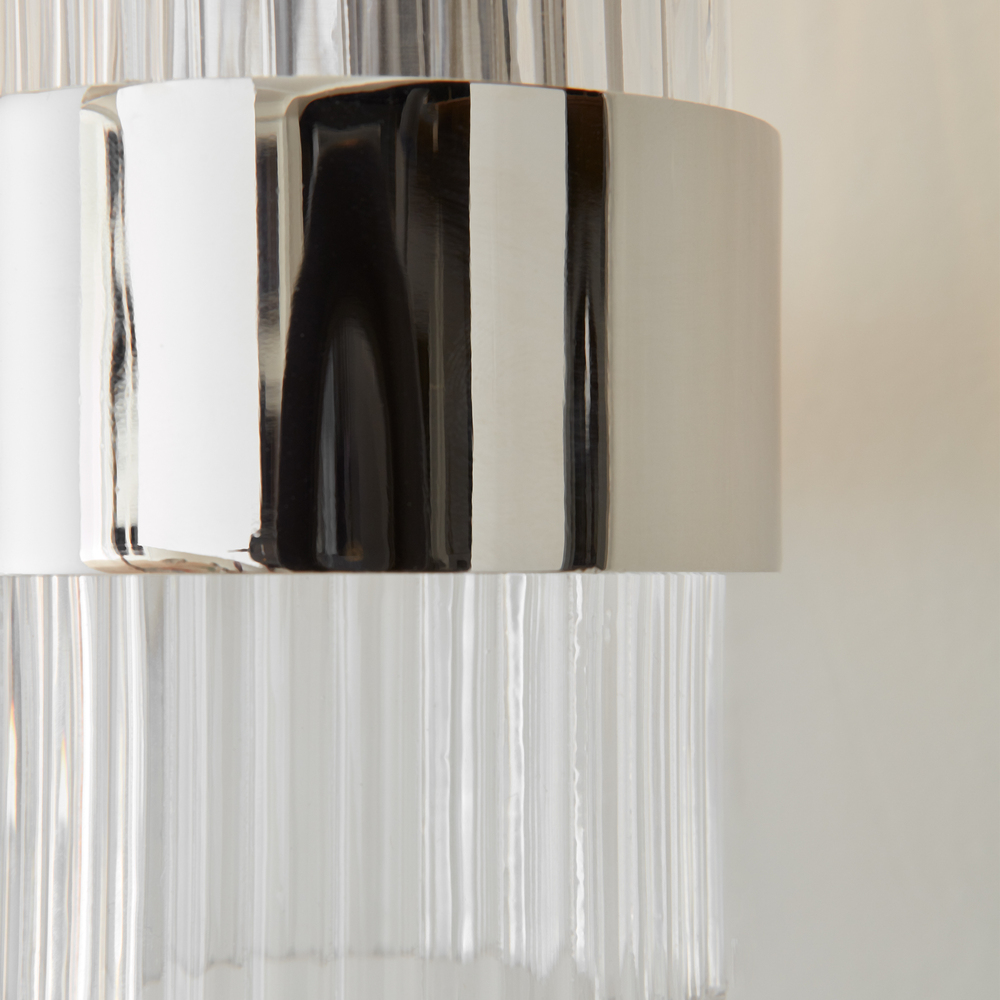 In the Geneva three light vanity fixture, slender, fluted shades form an elegant, dynamic silhouette that's balanced by a strong frame of Burnished Brass or Polished Nickel.