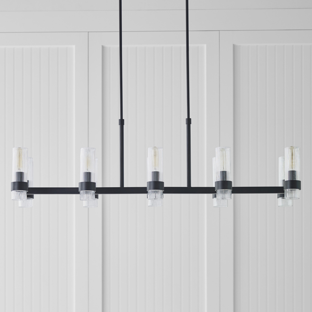 Designed by Chapman & Myers, the Geneva ten light billiard island chandelier in Aged Iron is the perfect way to achieve your desired fashion or functional needs in your home. A fluted shade forms an elegant, dynamic silhouette balanced by a strong frame of Aged Iron, Burnished Brass, or Polished Nickel.