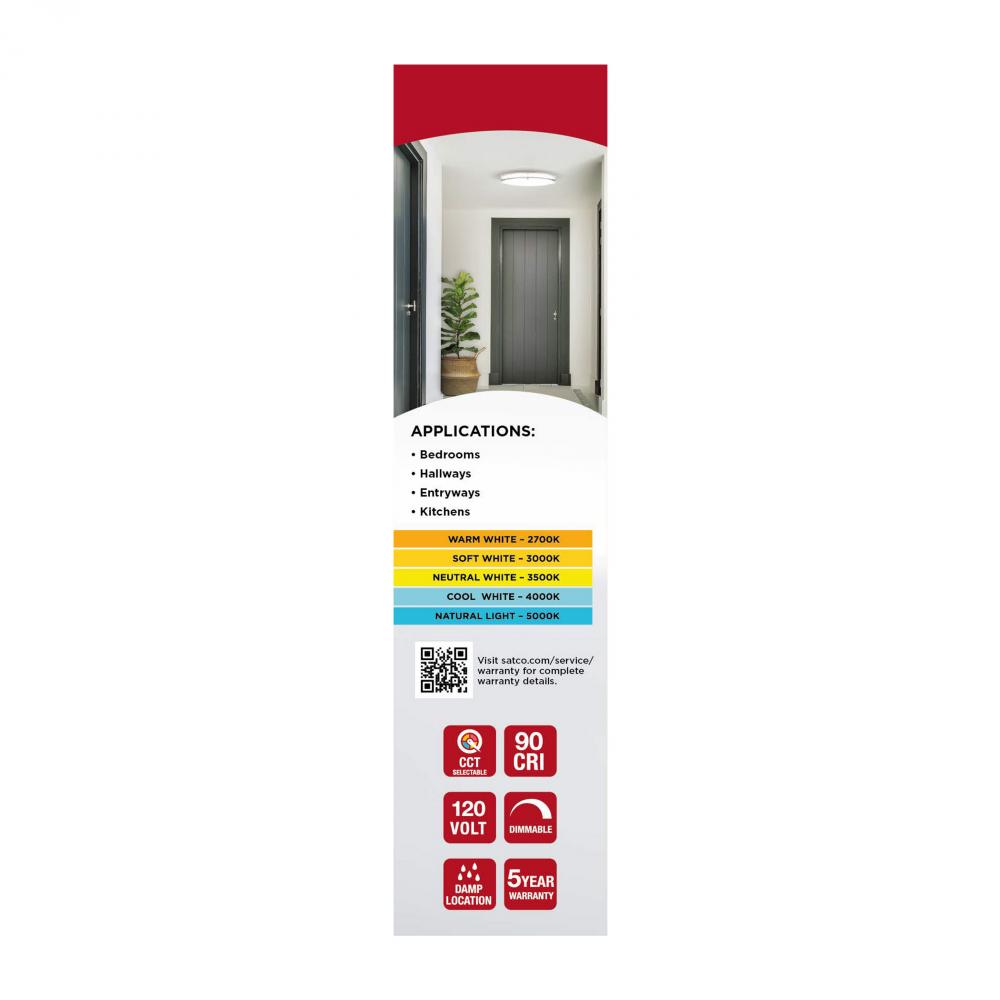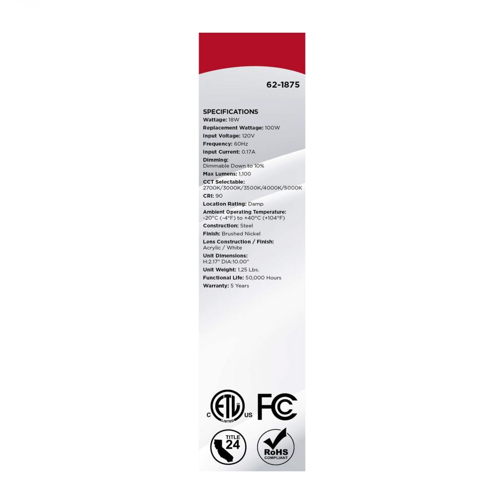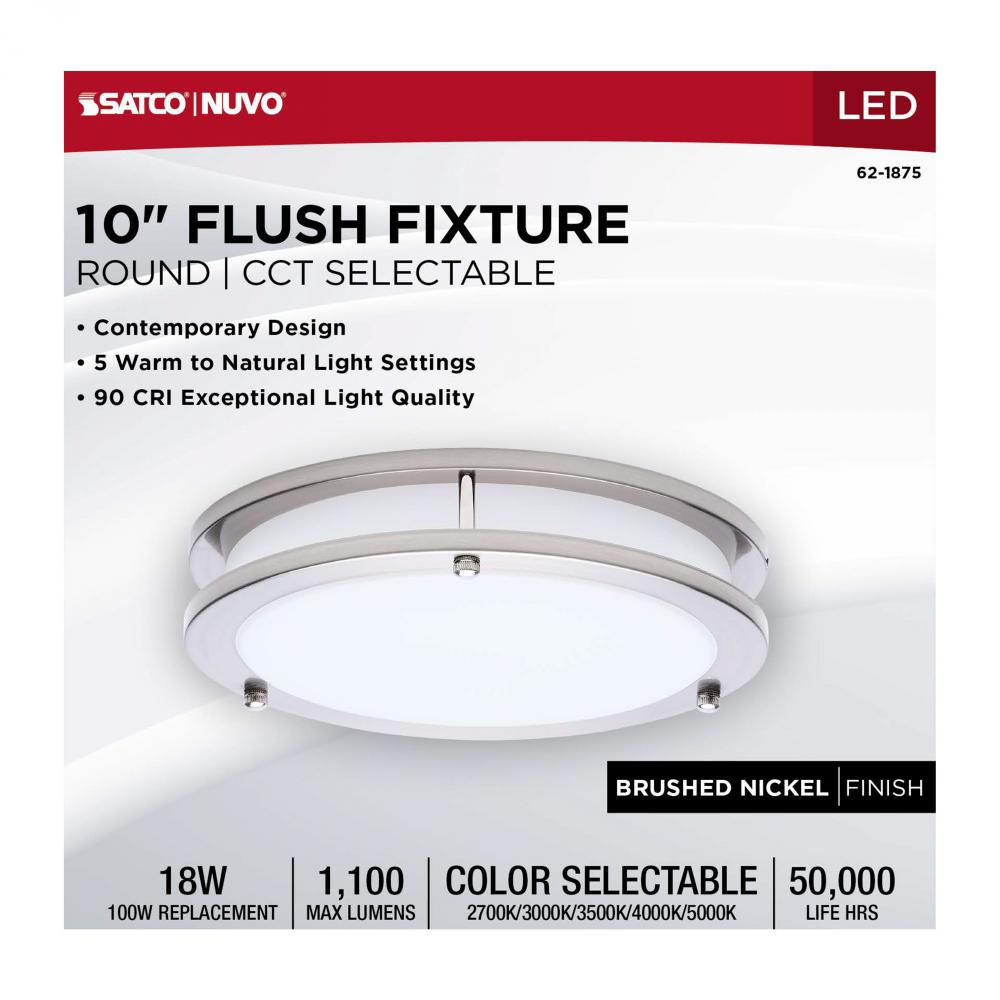 The SATCO NUVO 62-1875, Glamour 10-inch Round Flush Mount in Brushed Nickel delivers sleek, modern lighting with 5 CCT selectable technology (2700K–5000K) and 90 CRI illumination for vibrant color rendering. This 18-watt fixture replaces 100W incand
