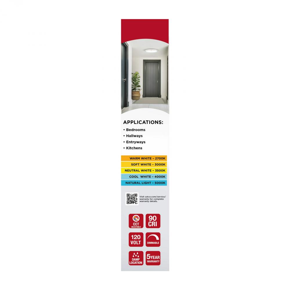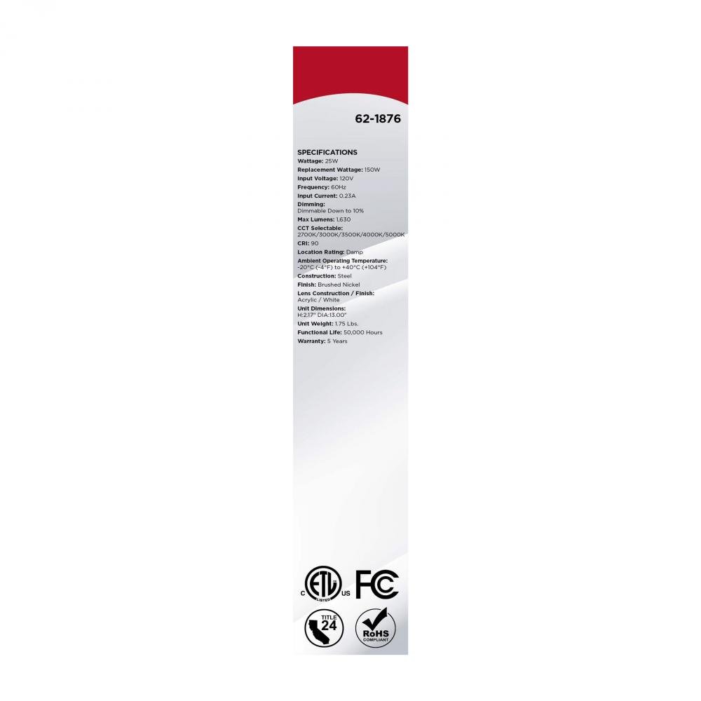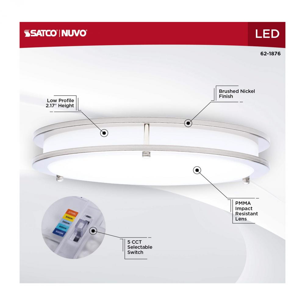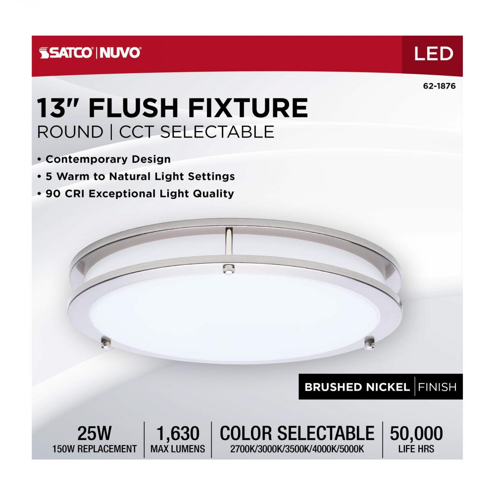 The SATCO NUVO 62-1876 Glamour 13-inch Round Flush Mount in Brushed Nickel delivers sleek, modern lighting with 5 CCT selectable technology (2700K–5000K) and 90 CRI illumination for enhanced color rendering. This 25-watt fixture replaces 150W incand