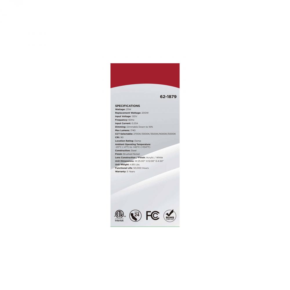 The SATCO NUVO 62-1879 Glamour 25-inch Linear Fixture in Brushed Nickel offers sleek, modern lighting with 5 CCT selectable technology (2700K–5000K) and 90 CRI illumination for vibrant color rendering. This 25-watt fixture replaces 200W incandescent