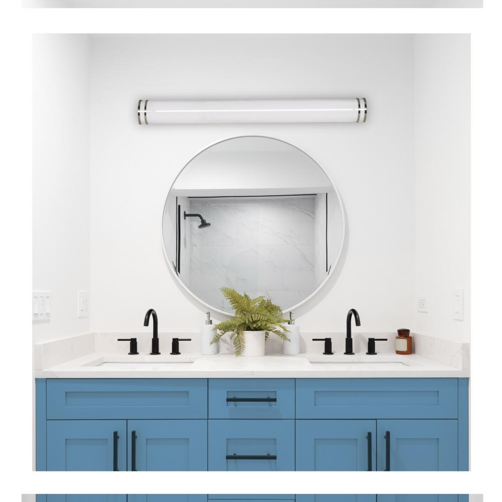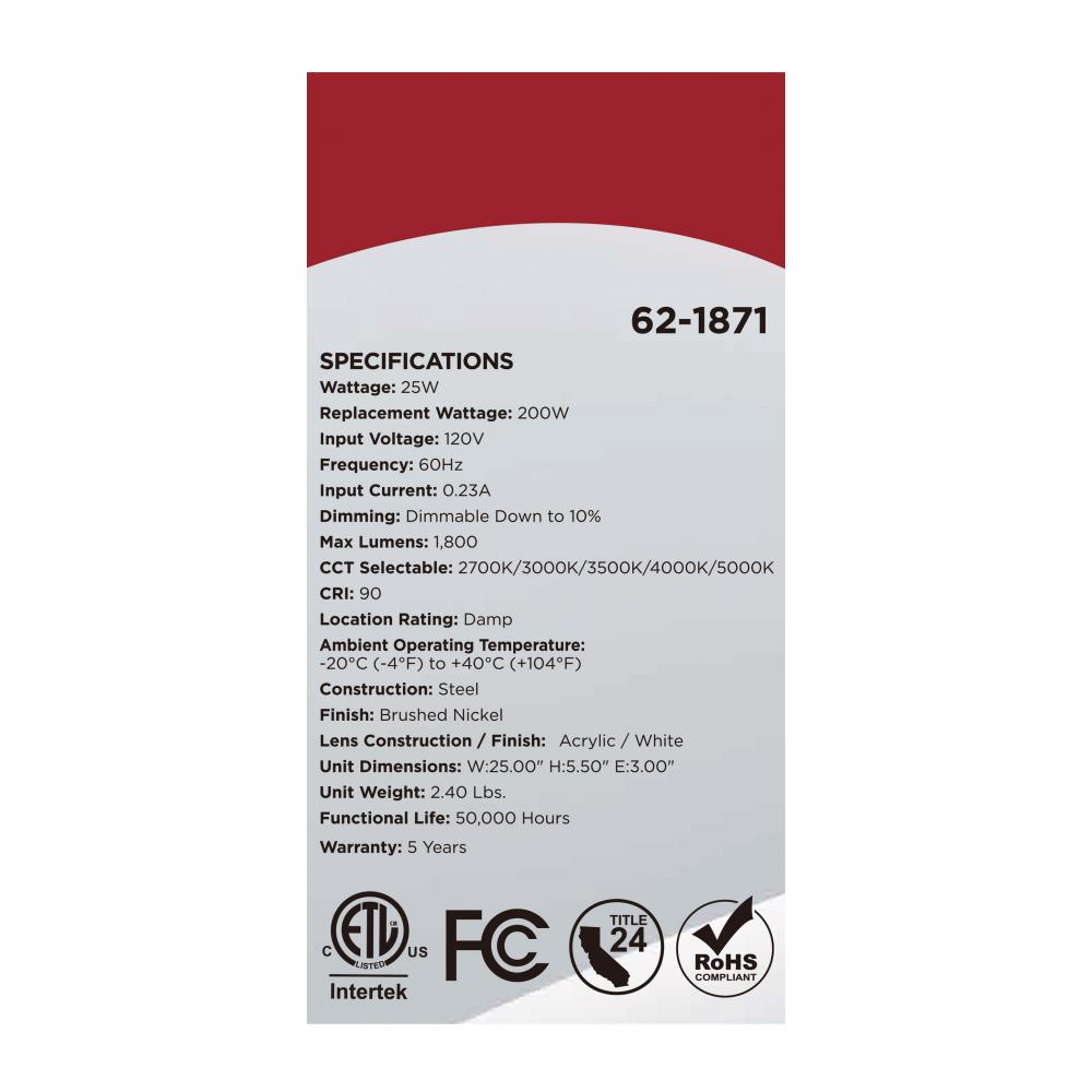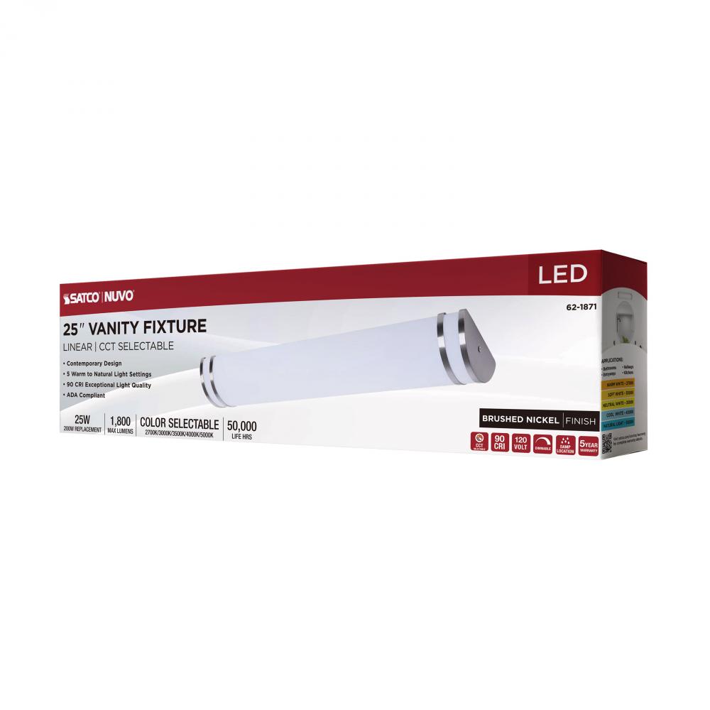 The SATCO NUVO 62-1871 Glamour 25-inch Vanity Fixture in Brushed Nickel offers sleek, modern lighting with 5 CCT selectable technology (2700K–5000K) and 90 CRI illumination for vibrant color rendering. This 25-watt fixture replaces 200W incandescent
