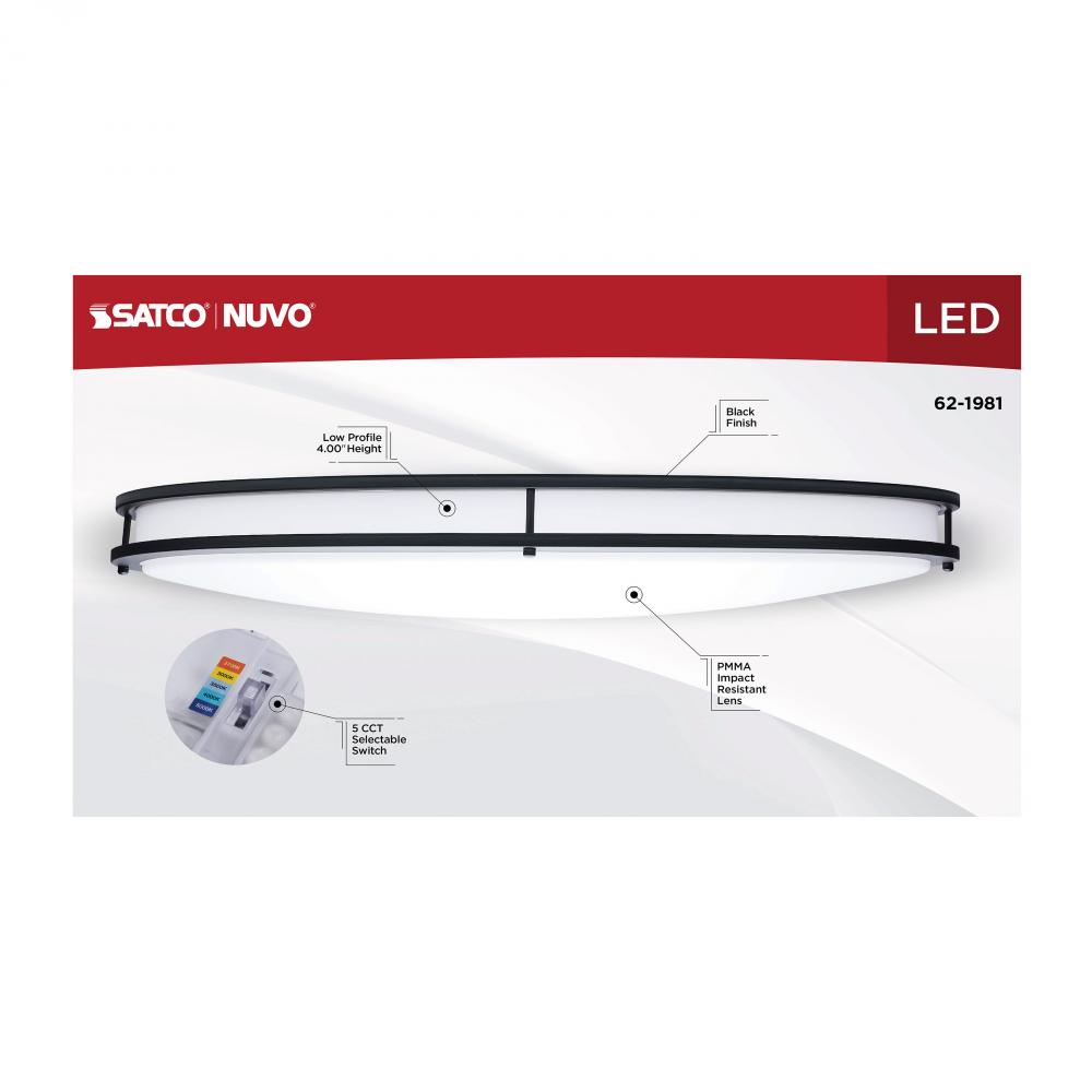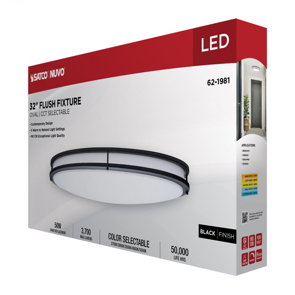 The SATCO NUVO 62-1981 Glamour 32-inch Oval Flush Mount in White with a Black Finish combines modern design with energy-efficient performance, featuring 5 CCT selectable technology (2700K–5000K) and 90 CRI illumination for superior color rendering.