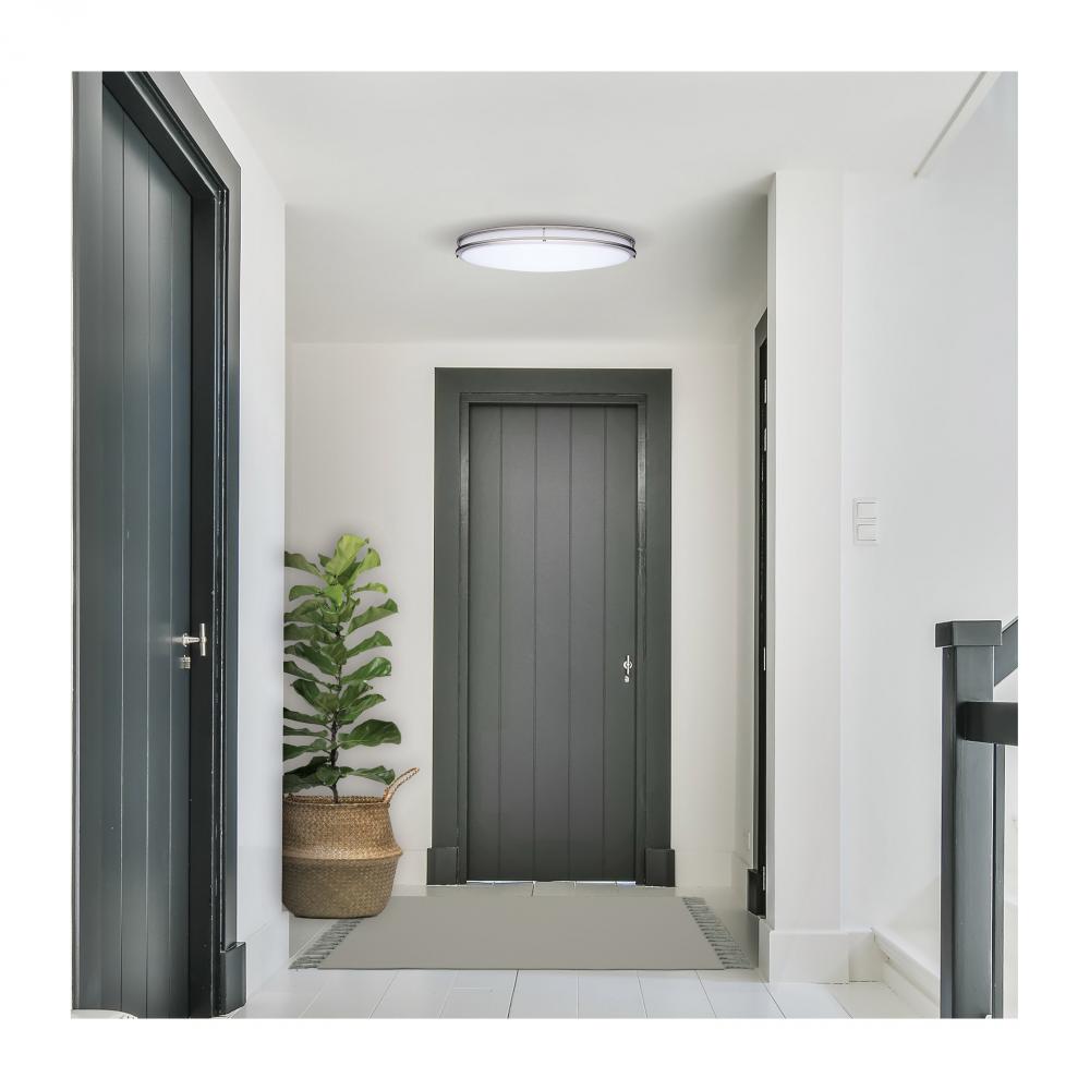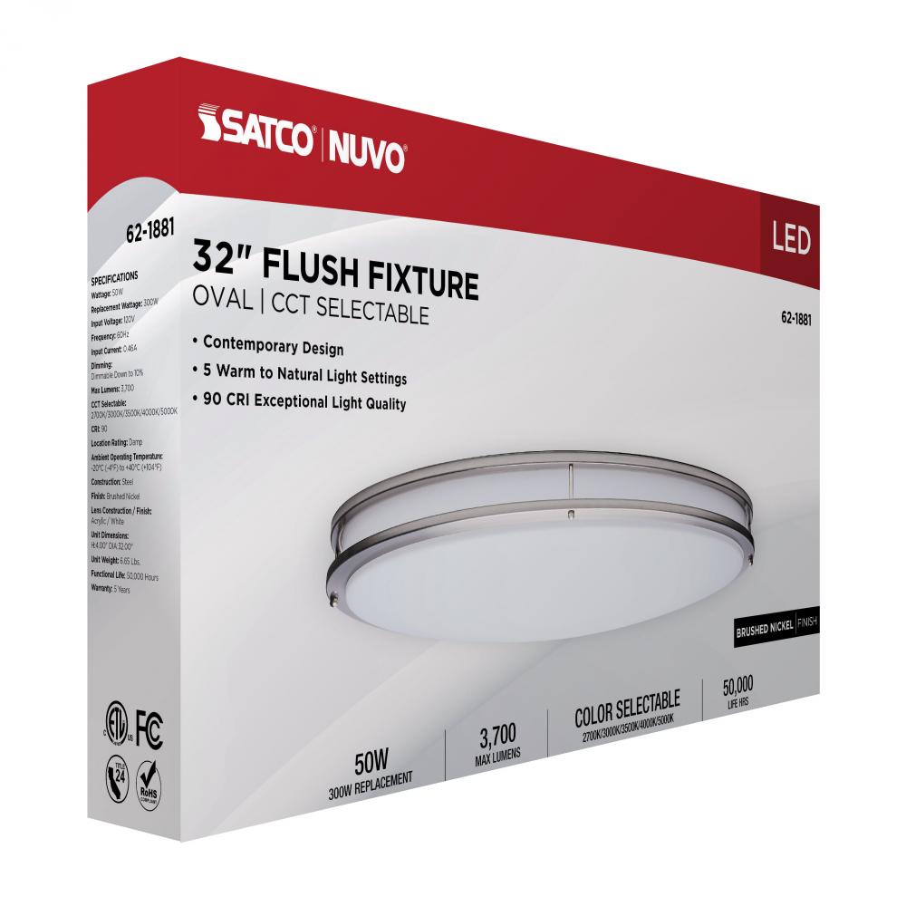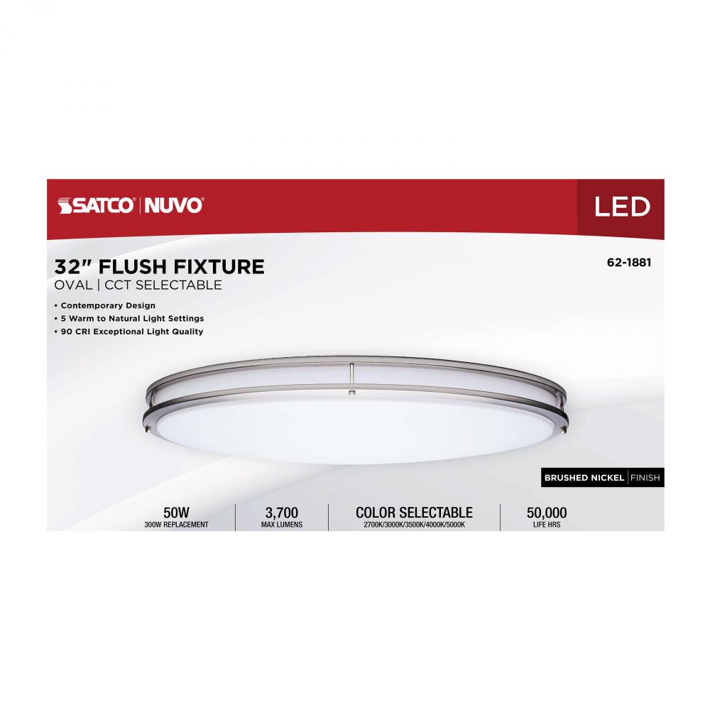 The SATCO NUVO 62-1881 Glamour 32-inch Oval Flush Mount in Brushed Nickel combines modern design with energy-efficient performance, featuring 5 CCT selectable technology (2700K–5000K) and 90 CRI illumination for superior color rendering. This 50-wat