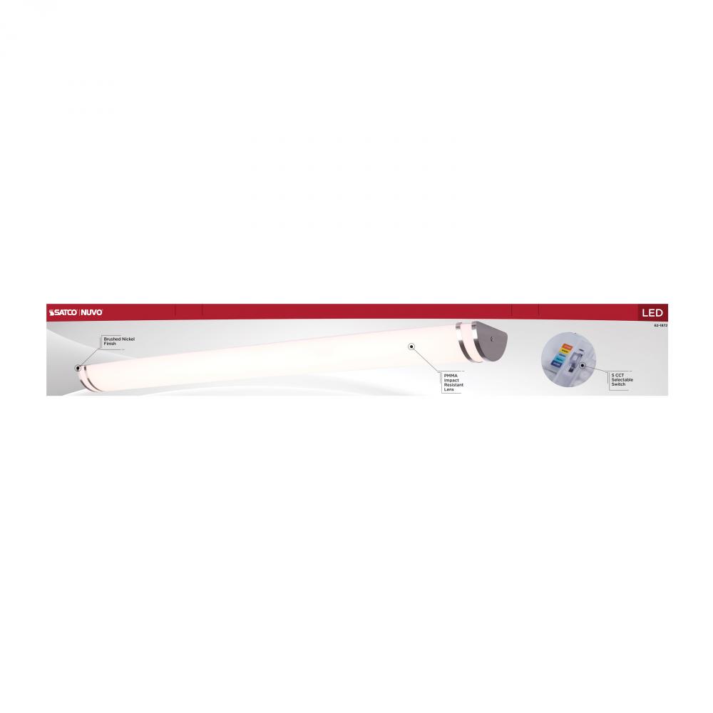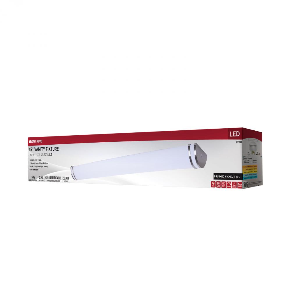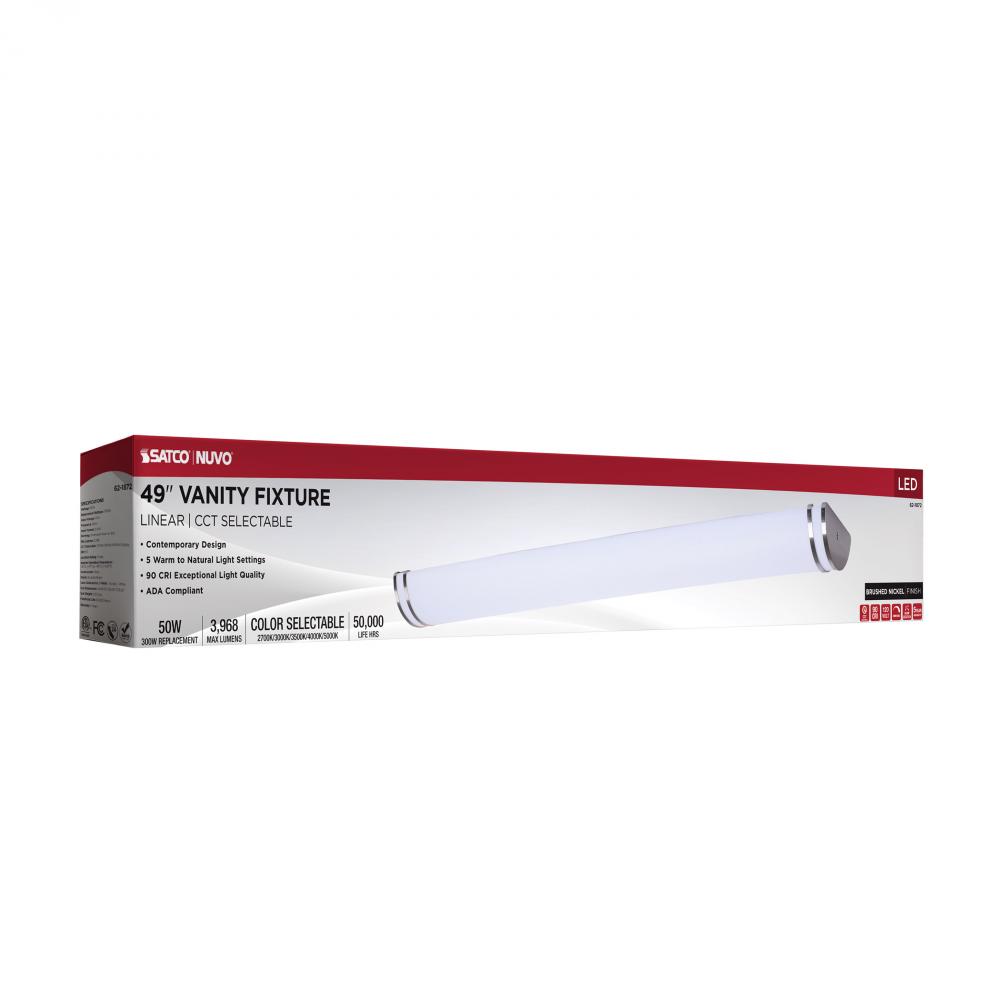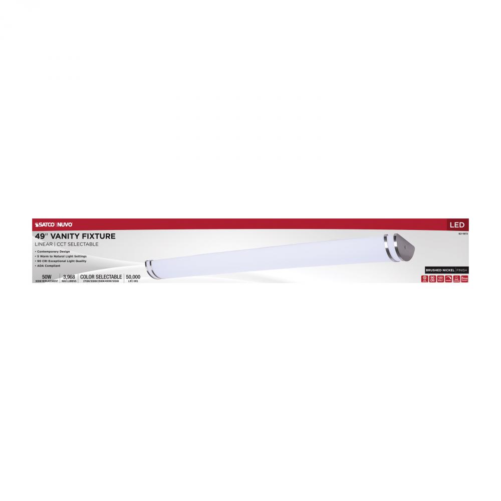 The SATCO NUVO 62-1872 Glamour 49-inch Vanity Fixture in Brushed Nickel combines sleek design with 5 CCT selectable technology (2700K–5000K) and 90 CRI illumination for superior color rendering. This 50-watt fixture replaces 300W incandescent lighti