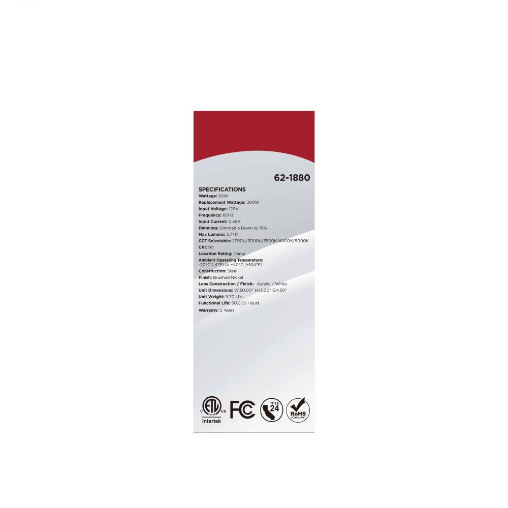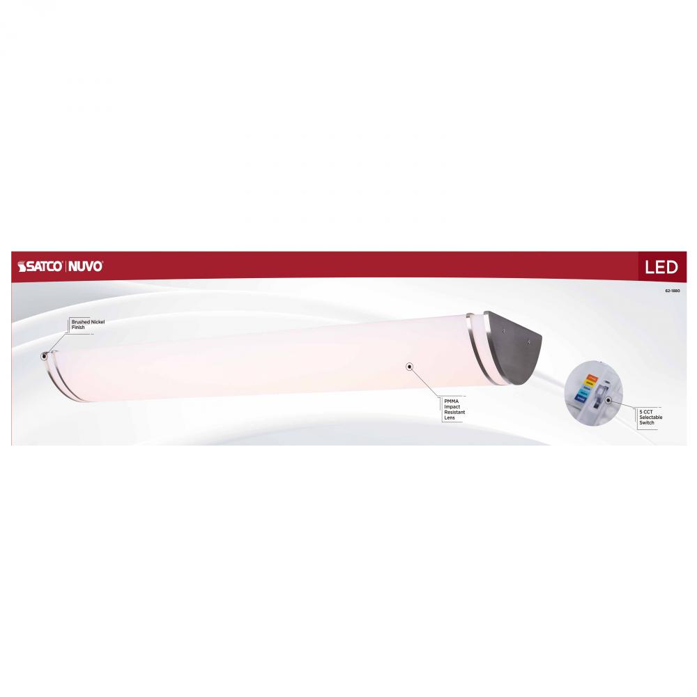 The SATCO NUVO 62-1880 Glamour 50-inch Linear Fixture in Brushed Nickel combines modern design with 5 CCT selectable technology (2700K–5000K) and 90 CRI illumination for enhanced color rendering. This 50-watt fixture replaces 300W incandescent light