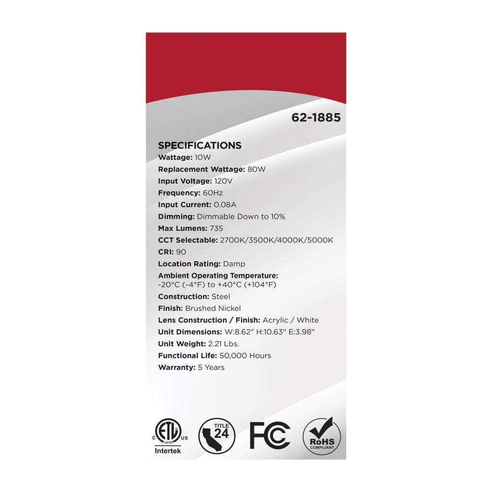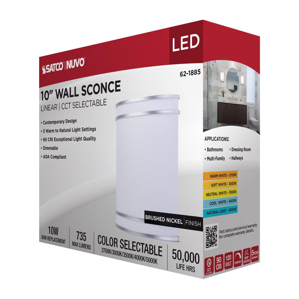 The SATCO NUVO 62-1885 Glamour Wall Sconce in Brushed Nickel delivers sleek, modern lighting with 5 CCT selectable technology (2700K–5000K) and 90 CRI illumination for vibrant color rendering. This 10-watt fixture replaces 80W incandescent lighting,