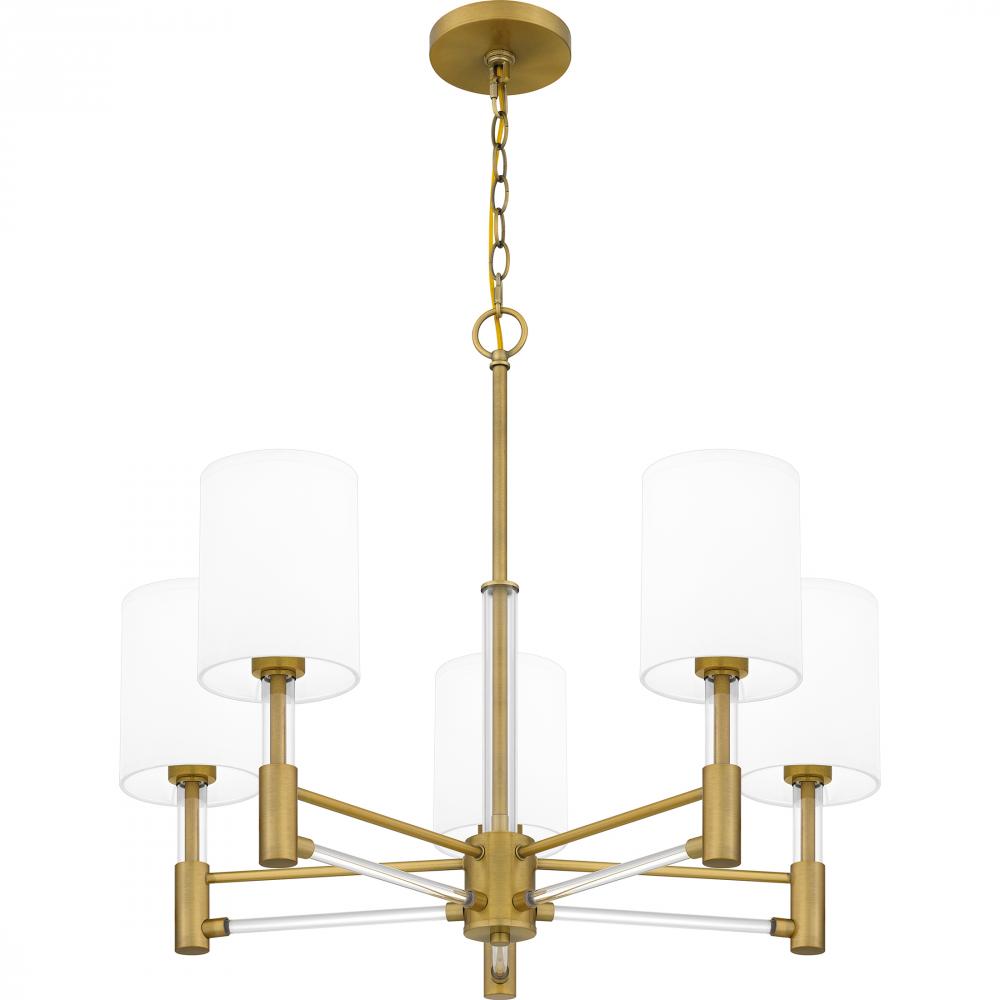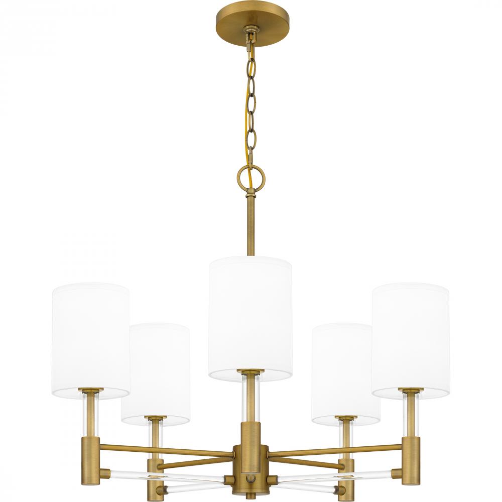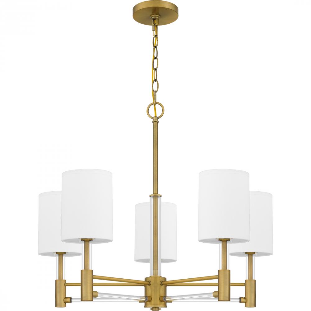 Off-white fabric shades add a touch of sophistication to Gretchens classic silhouette. Clear linear accents add glamour and shine to the aged brass finish. The delicate contrast creates a sense of drama in the otherwise modest chandelier design, making Gre