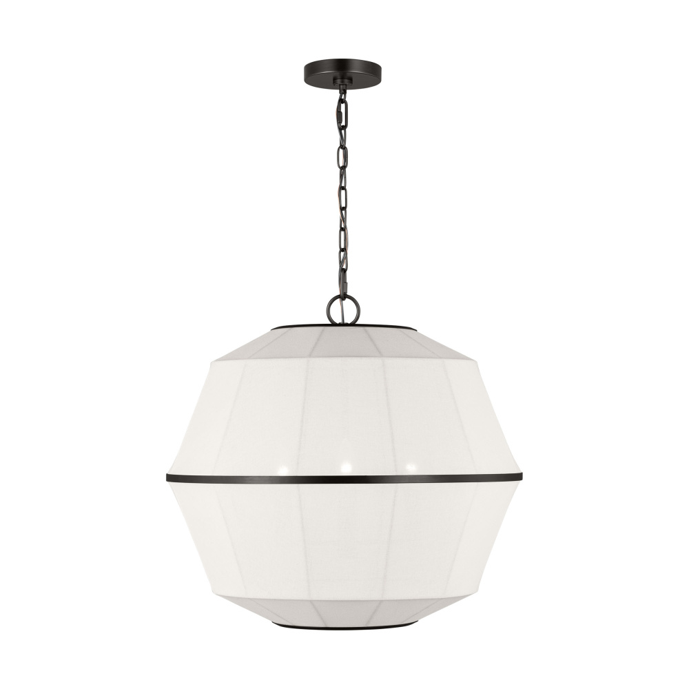 Showcasing multifaceted geometry, the Hikari series by Ellen DeGeneres is inspired by her personal collection of sculptural lighting. Grounded by the contrast of hard and soft materials, the aged iron and white linen fixture radiates soft, diffused light. The Hikari pendant can be used in a dining room, living room, bedroom or entryway.