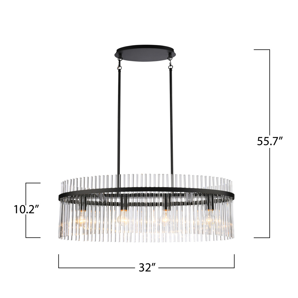 The Ava Collection oval chandelier enchants with its delicate arrangement of circular glass rods, elegantly suspended on a sleek black frame. Its versatile design harmonizes beautifully with both circular and rectangular tables, adding a touch of refined glamour to any room. (This model is easily height adjustable to meet you preference)